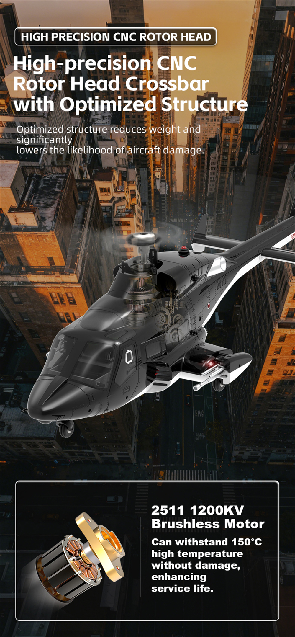 The high-precision CNC rotor head keeps weight down and protects the helicopter during those inevitable rough moments, while the large 4.3G digital servo gives you sharp, precise feedback that experienced pilots will genuinely appreciate. The brushless motor handles fast response and heat resistance up to 150°C, meaning it won’t tap out on you during extended sessions.