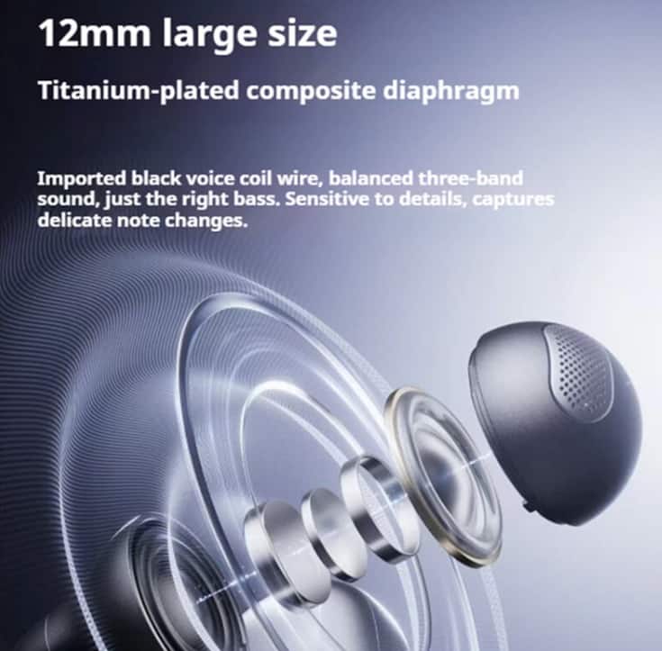 Despite its open-ear design, the HUAZAIHALO delivers impressive audio performance. Equipped with 12mm large titanium-plated composite diaphragm drivers, these earbuds produce: