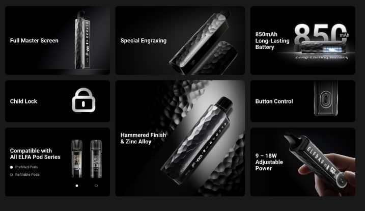 According to the official website of the ELFBAR brand, the ELFA MASTER Stein limited edition features hammer-patterned designs and zinc alloy for its appearance. It is available in two colors: Obsidian Black and Meteor Grey, while the ELFA MASTER comes in five regular colors.