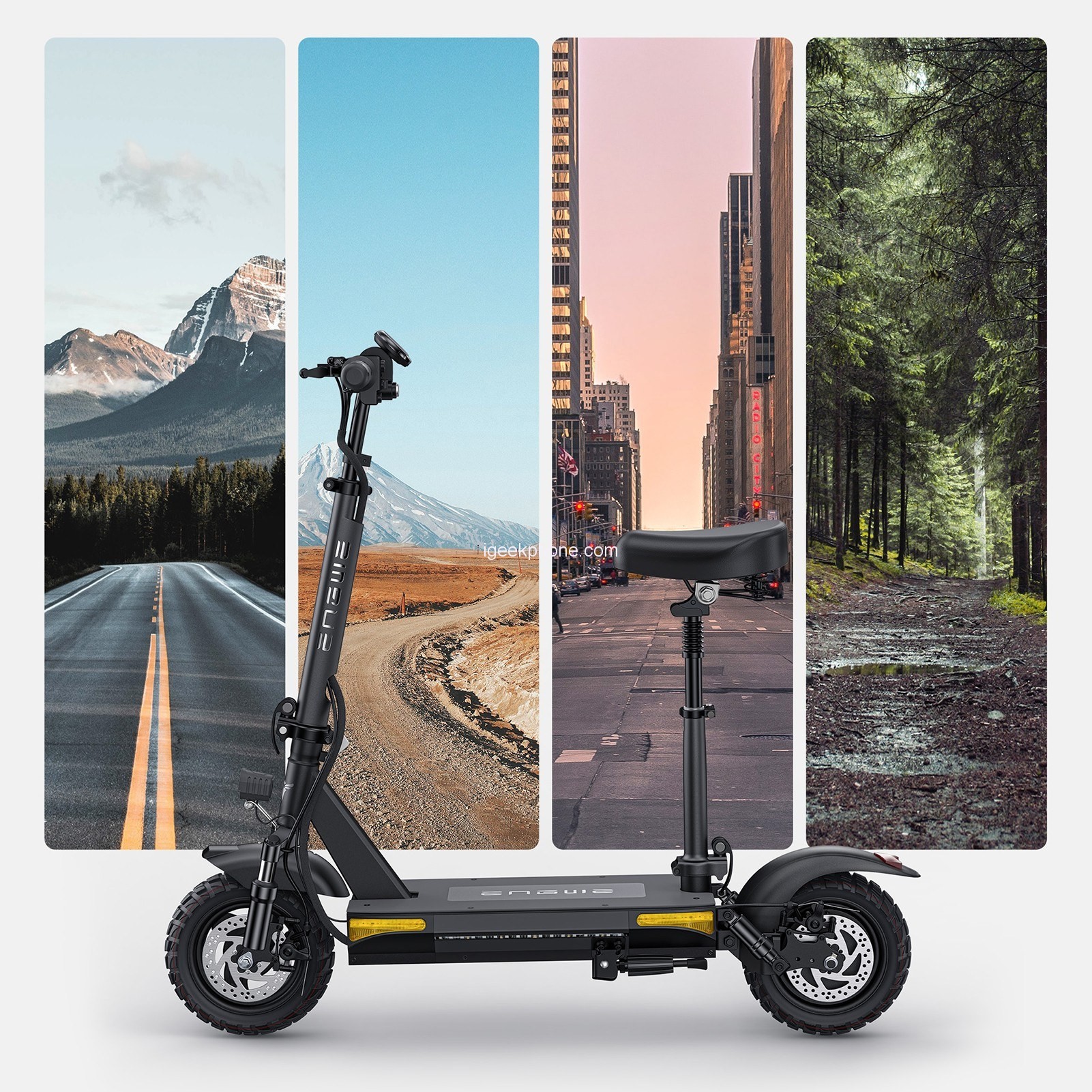 ENGWE S6 comes with its 10-inch puncture-resistant tubeless tires, so navigating challenging terrains becomes a smooth and comfortable endeavor. The generous 9.4″ wide pedal ensures ample space for relaxed standing, even on longer rides. Tailoring the scooter to your preferences is effortless thanks to the adjustable handlebar and seat height. Enhanced safety is achieved through multiple light sources that enhance your visibility to drivers and pedestrians.