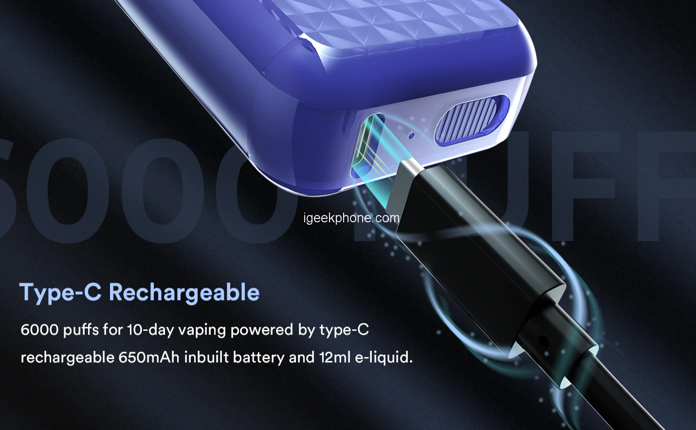 First of all, its 12 milliliters capacity allows this vaper to last approximately 6000 puffs, a number well above the average that guarantees a very long lifespan. In addition, as its 650 mAh battery is likely to run out before the liquid does, it has a USB Type-C slot for charging and continued use of the product.