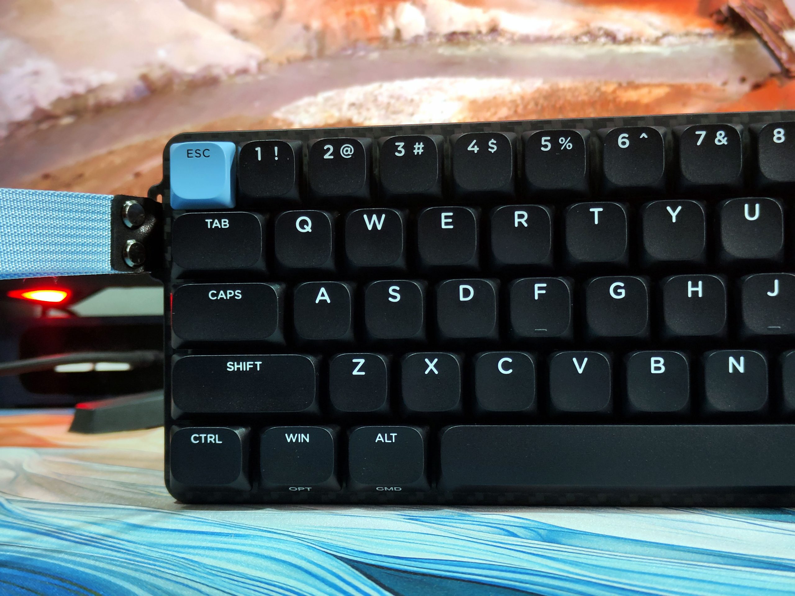 But there are compatibility issues with the Carbon60. Users may also be frustrated with onboard storage for the wireless dongle and the sometimes finicky software setup. Its slim profile forgoes tilt or height adjustments and lacks a wrist rest. While marketed as VIA-compatible for key-remapping, finding it to recognize the software was tedious. Also attached is a travel strap in blue, which is functional for travelling but in day to day use was often cumbersome.