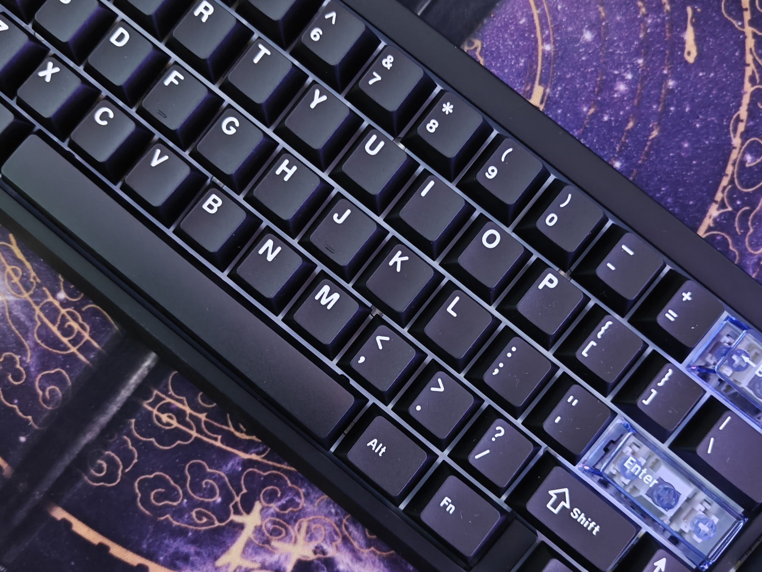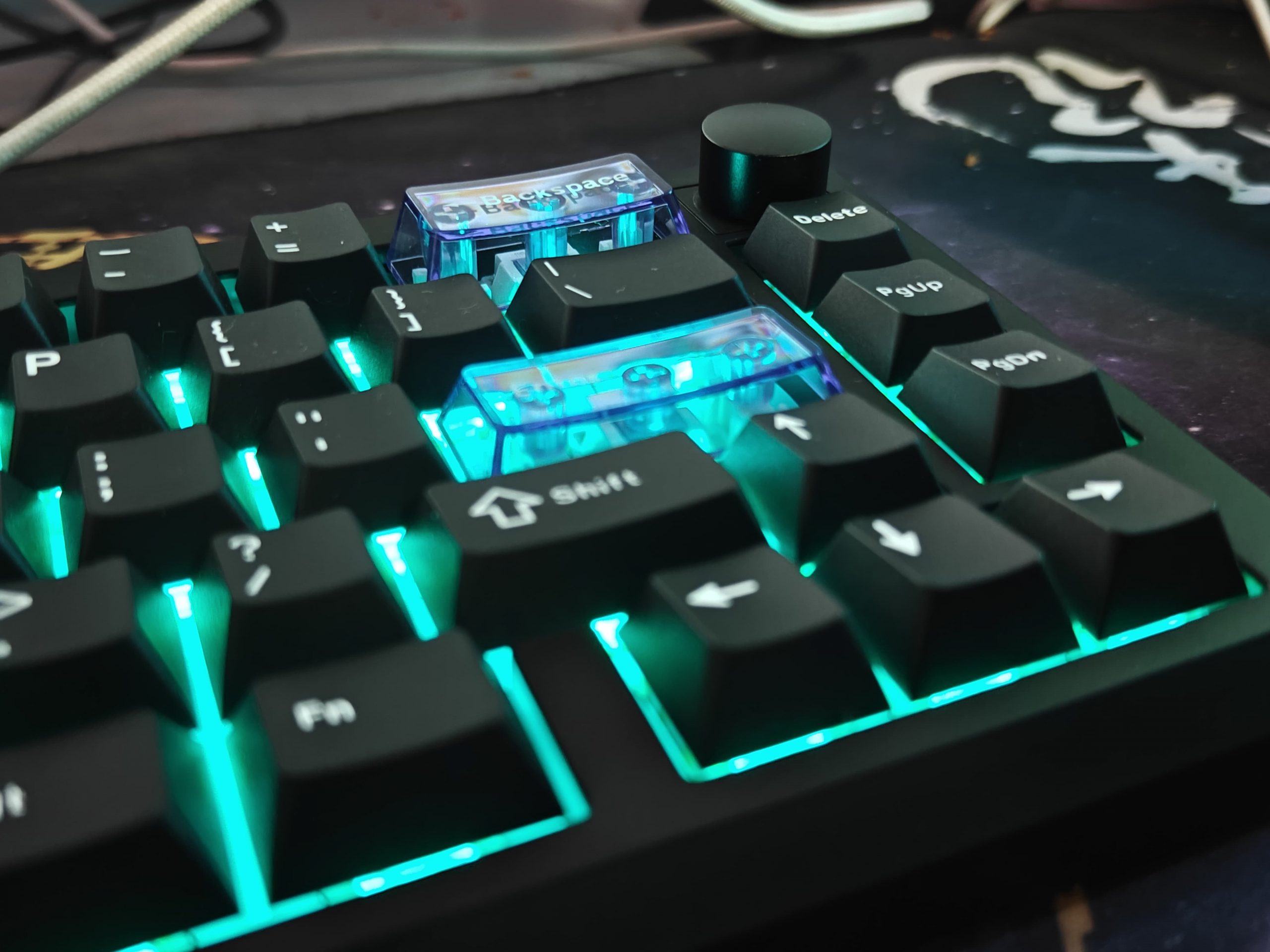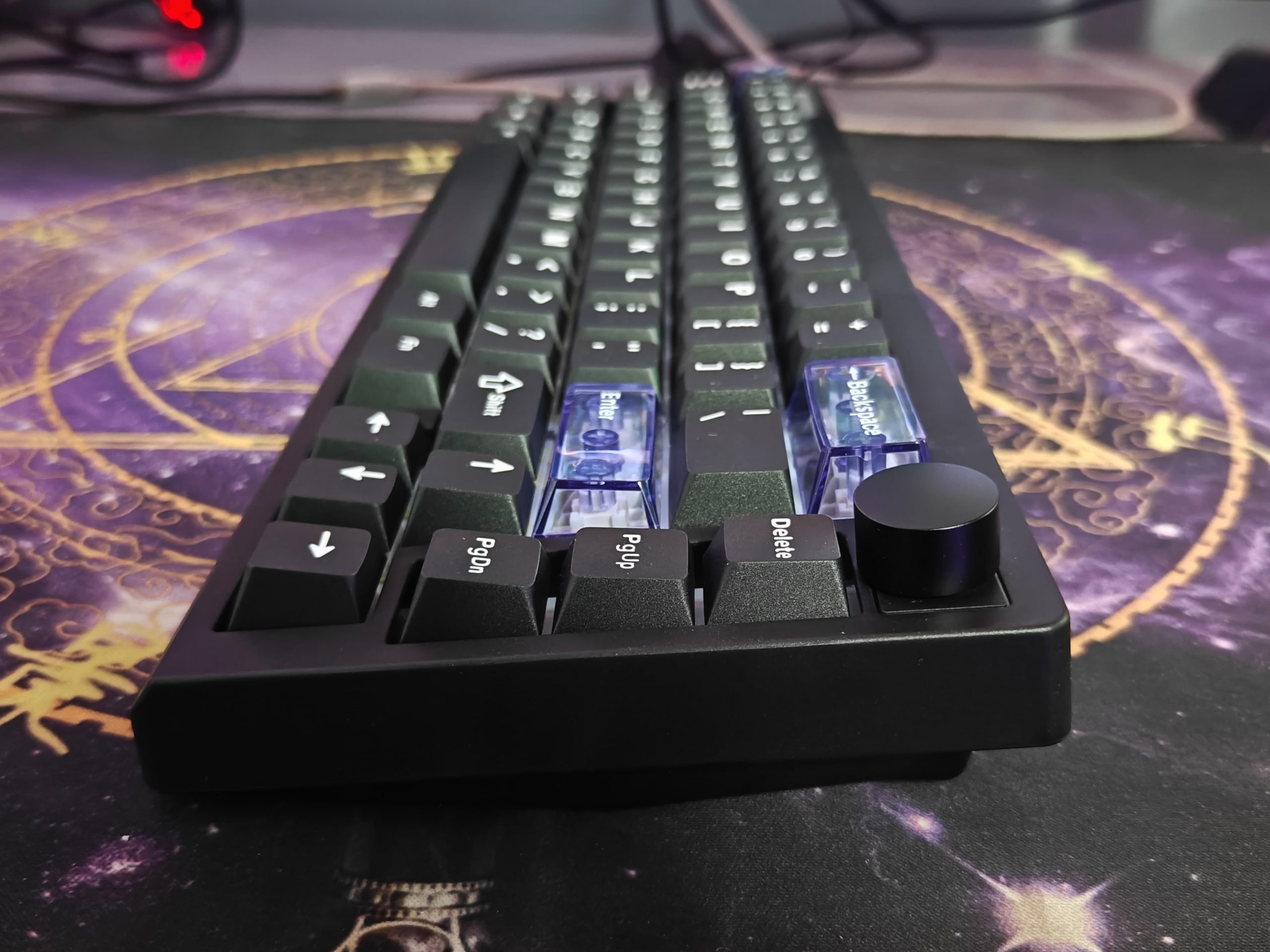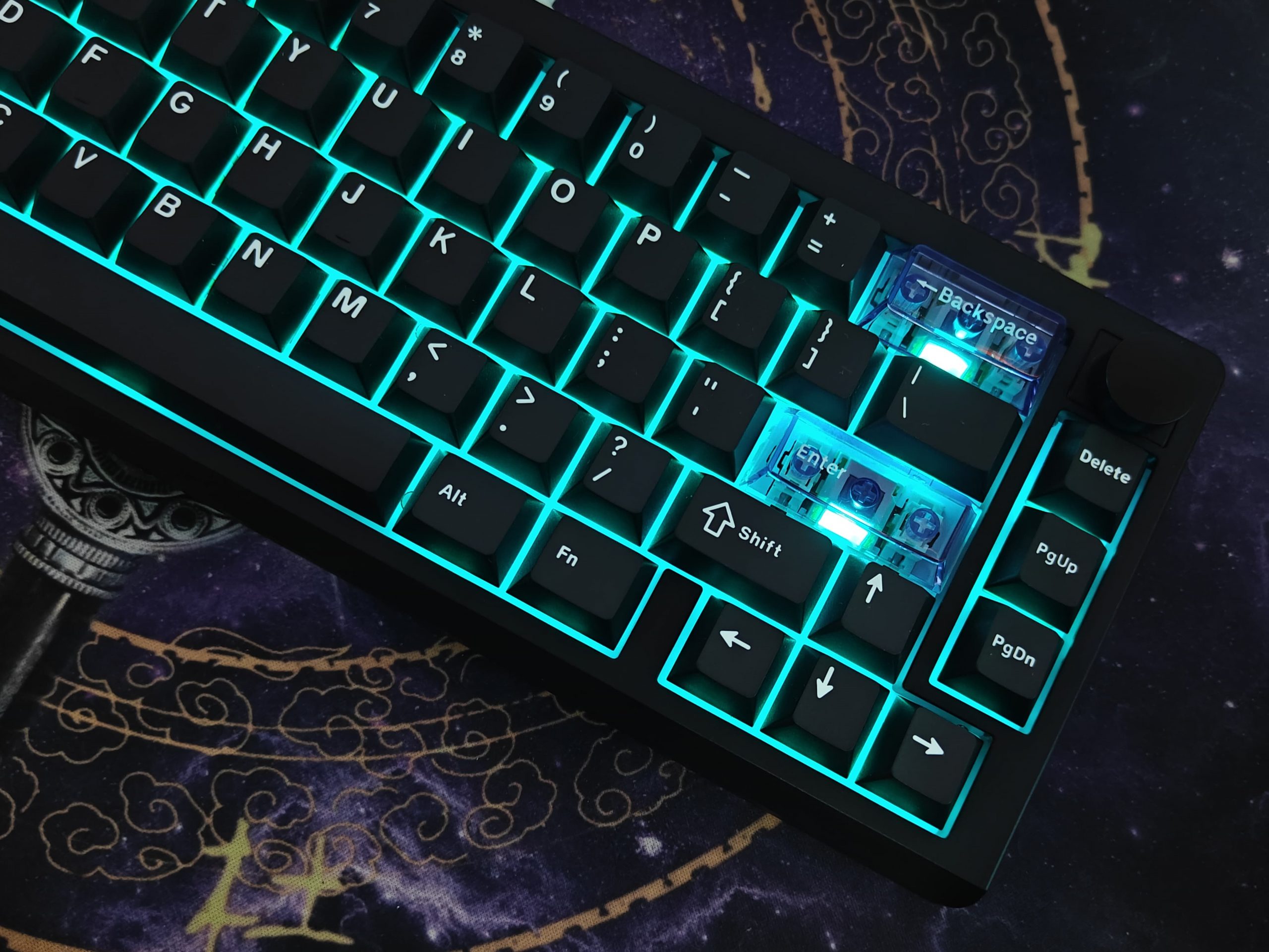 The keycaps are double-shot PBT, which from my experience means they’re going to hold up well and not get shiny or worn down quickly. The lettering looks clean too. They also threw in three transparent keycaps – ESC, Backspace, and Enter – which adds a little bit of character without going overboard.
