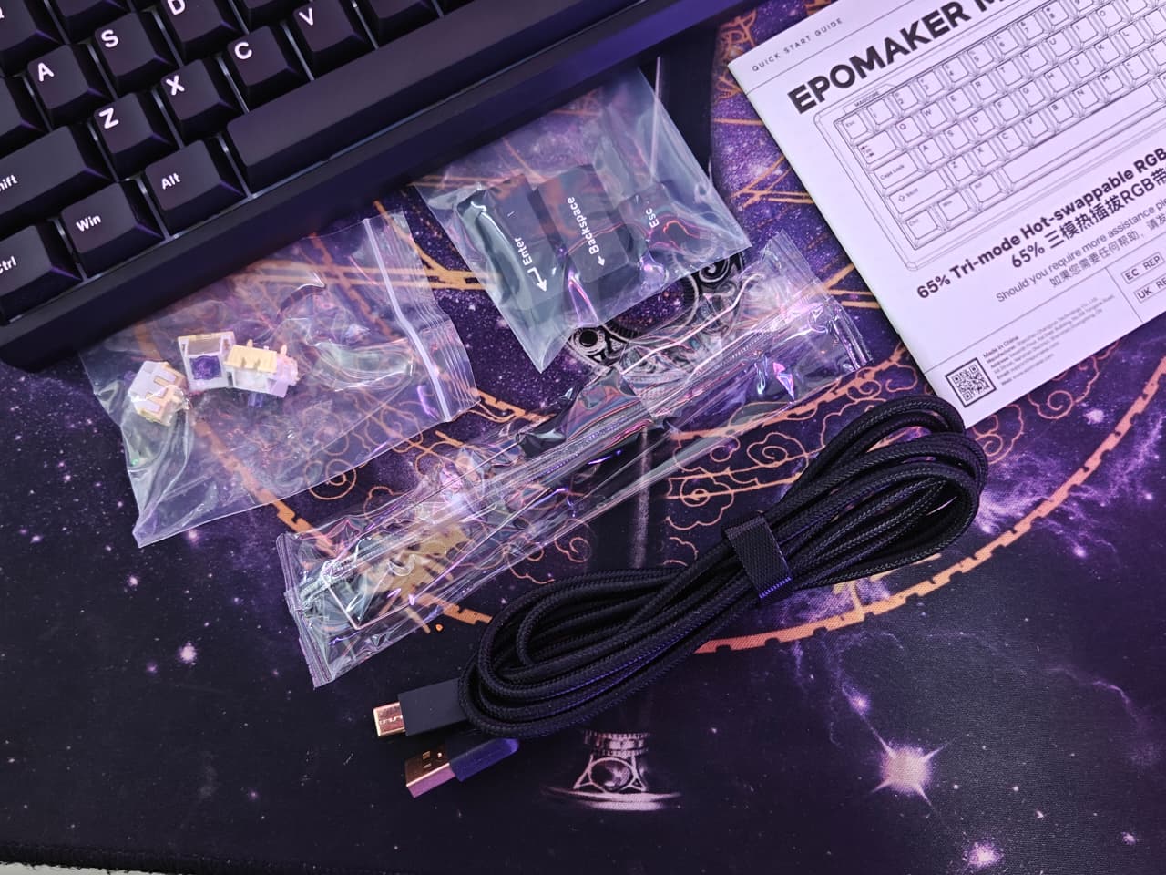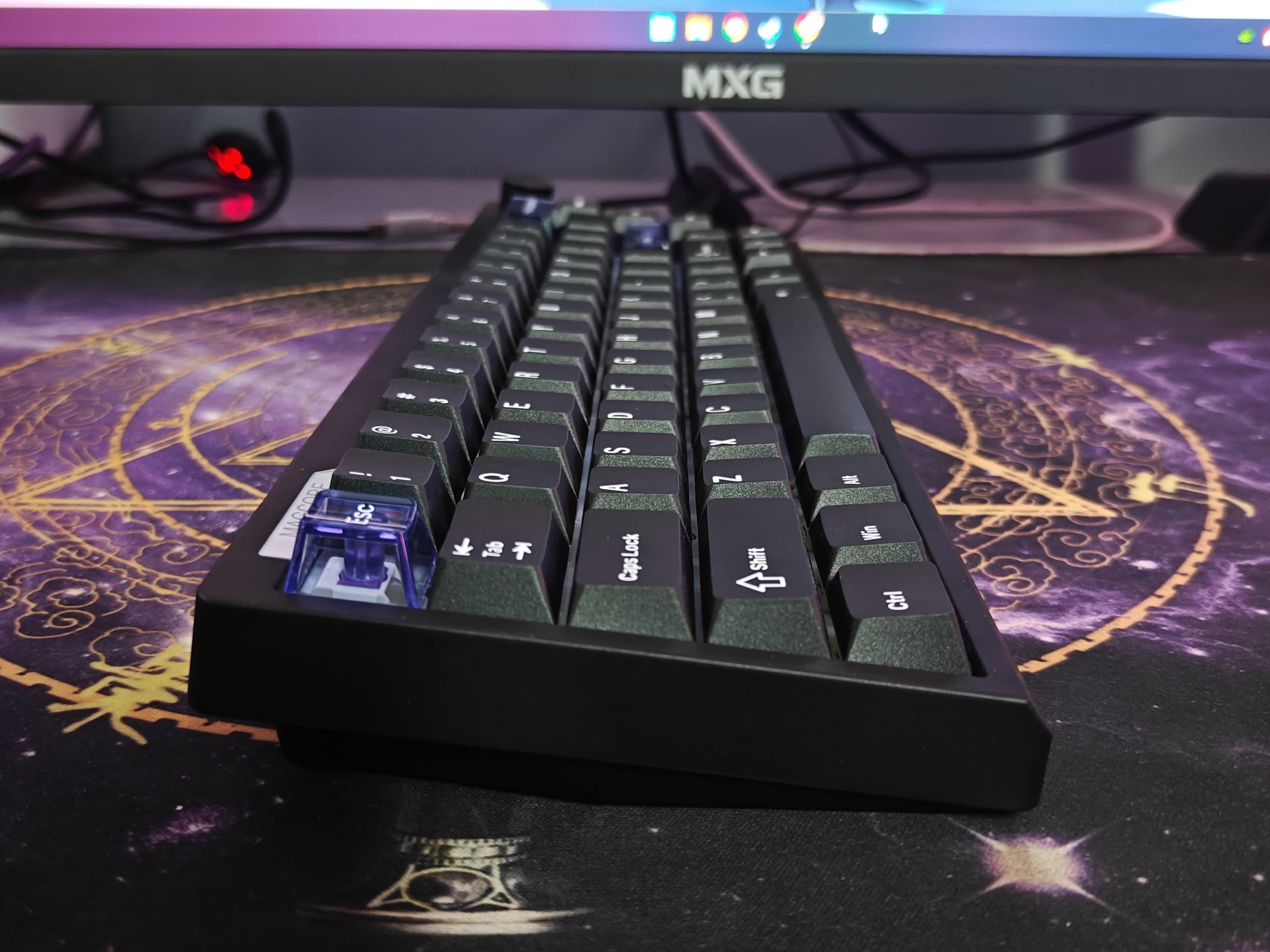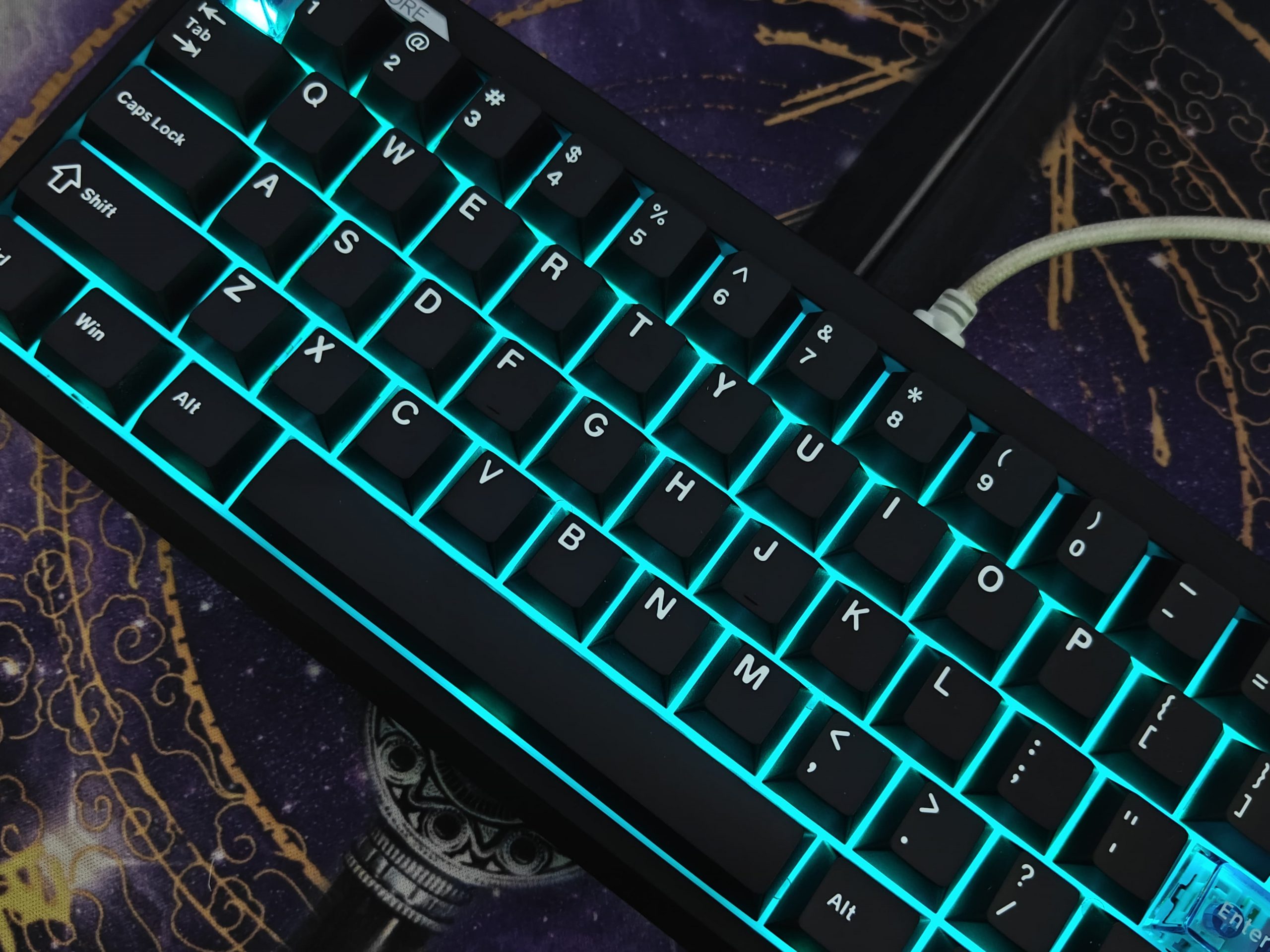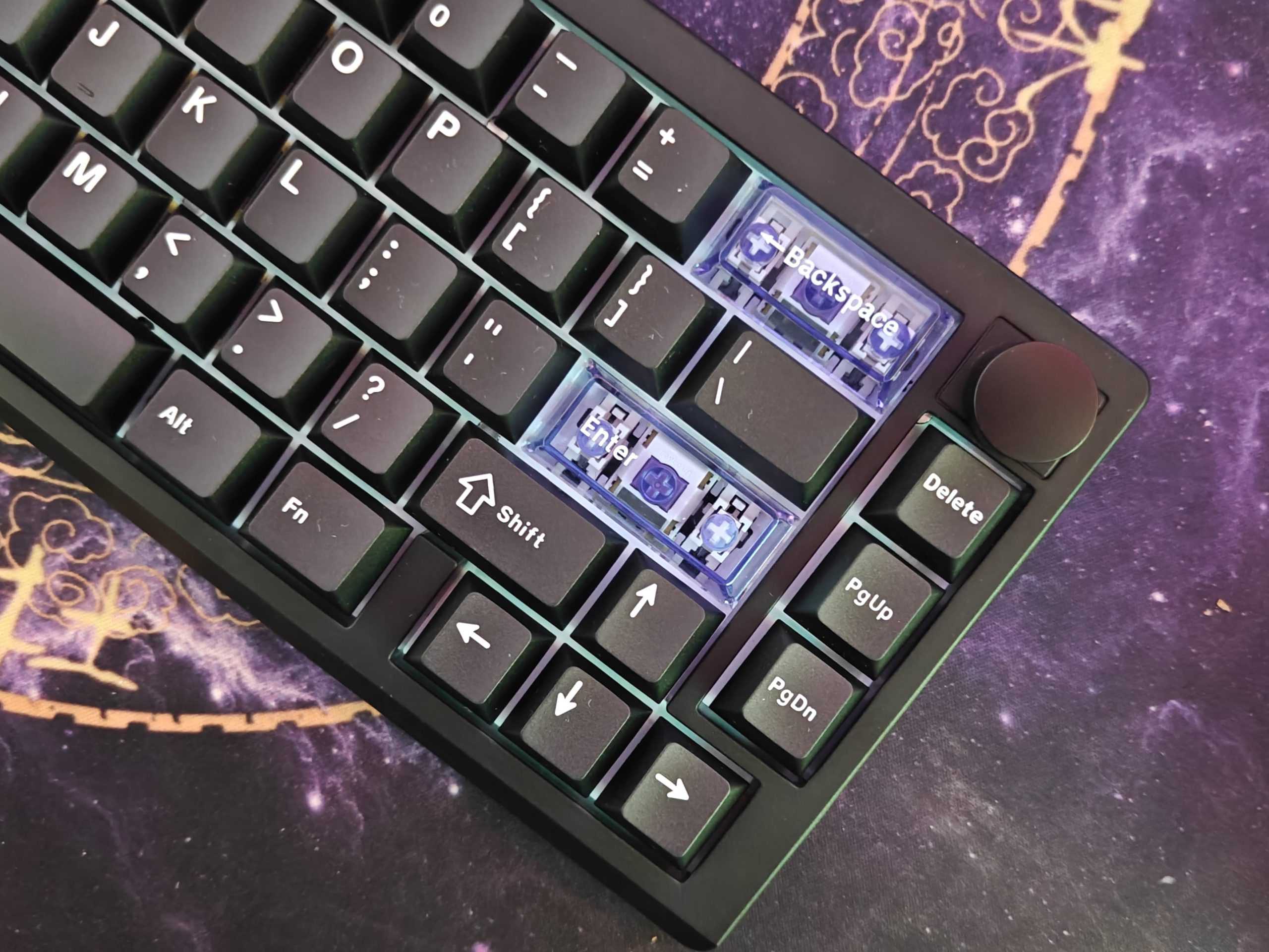 The keycaps are double-shot PBT, which from my experience means they’re going to hold up well and not get shiny or worn down quickly. The lettering looks clean too. They also threw in three transparent keycaps – ESC, Backspace, and Enter – which adds a little bit of character without going overboard.