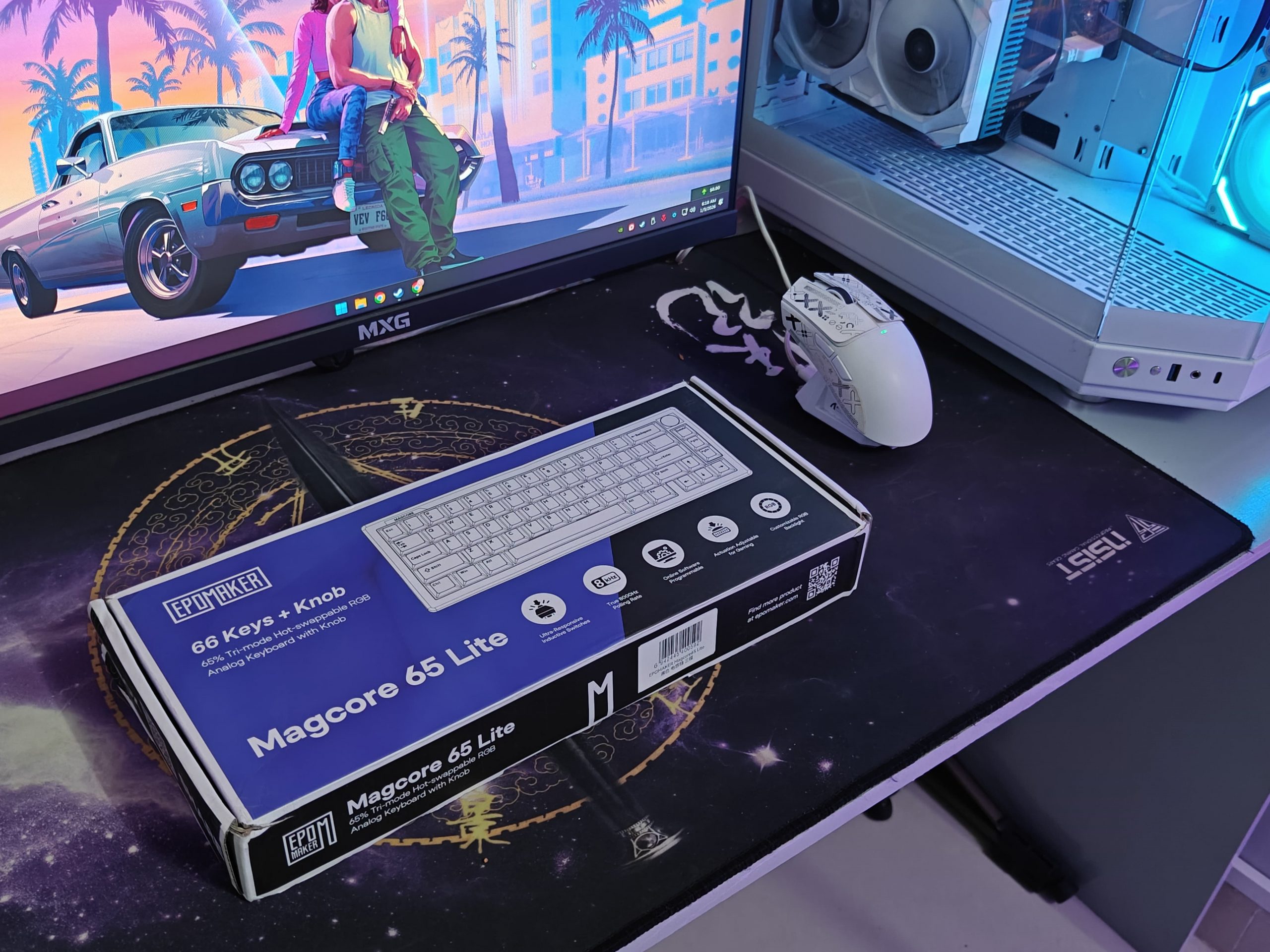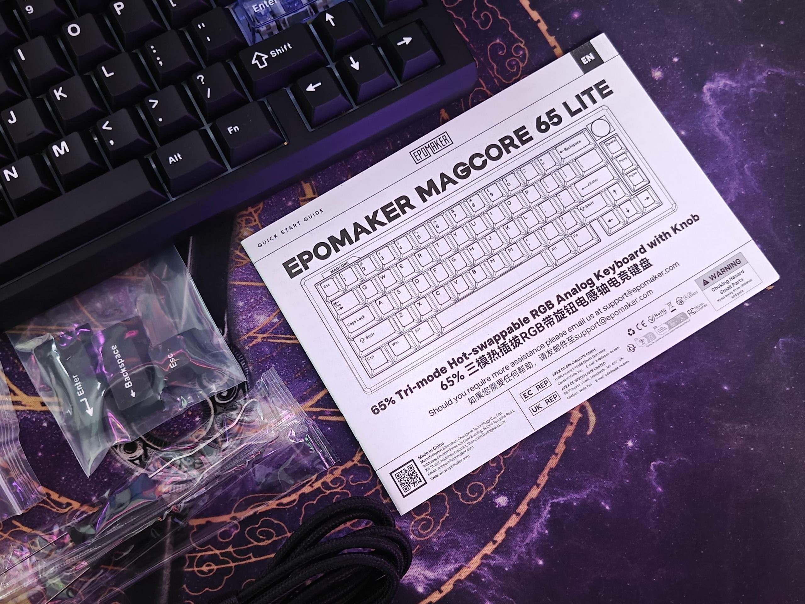 When the Epomaker Magcore65 Lite showed up, I was pretty happy with how they packed everything. The box itself looks decent, nothing too flashy, but they put the keyboard right on display with the main specs listed on the front so you know what you’re getting before you even open it.