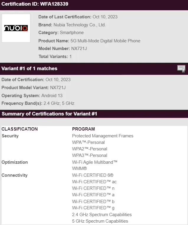 The Nubia Red Magic 9 / Pro also passed the certification of the Wi-Fi Alliance a few days ago, confirming that the factory is equipped with the Android 13 system and supports 2.4GHz and 5GHz band Wi-Fi wireless networks.