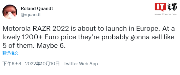 According to whistleblower Roland Quandt, the moto Razr 2022 will cost more than 1,200 euros (8,316 yuan) in Europe. That’s a hefty price — the base model (8GB+128GB) costs 5,999 yuan (about 865 euros), while the premium model (12GB+512GB) costs 7,299 yuan (about 1,050 euros). The mid-range model (8GB+256GB) will cost 6,499 yuan (about 940 euros).