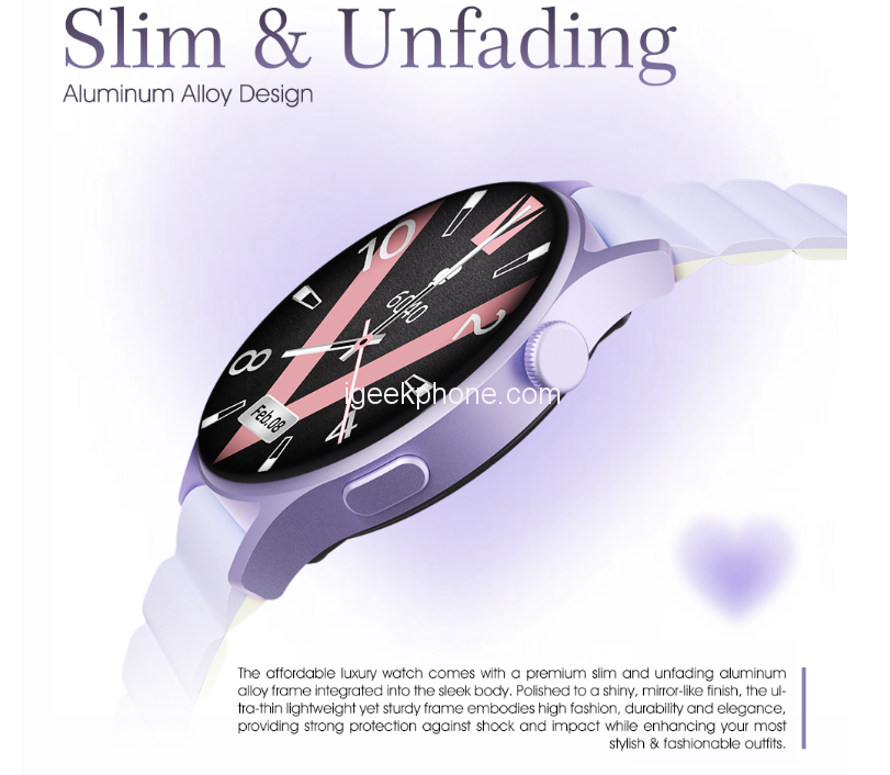The KIESLECT Lora 2 Smartwatch features a refined and fade-resistant aluminum alloy frame with a smooth and glossy finish. Its ultra-thin yet sturdy construction embodies high fashion, durability, and flexibility. Weighing only 43g, it is even lighter than its predecessor, ensuring a comfortable and effortless wearing experience. With its slim, streamlined design and lightweight construction, it complements any outfit as a fashionable accessory.