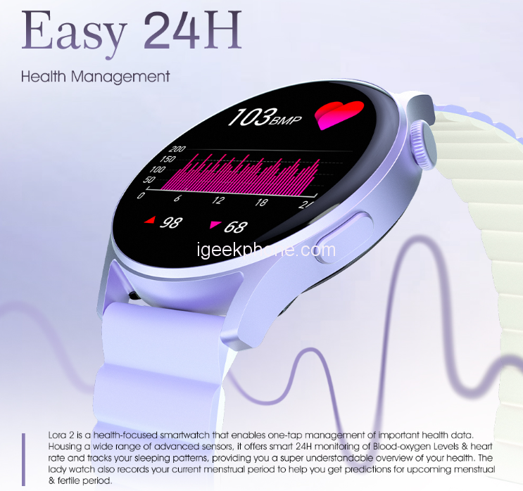 The KIESLECT Lora 2 is a health-focused smartwatch that allows you to effortlessly manage important health data with just a tap. Equipped with advanced sensors, it intelligently monitors your blood oxygen levels, heart rate, and sleep patterns, providing a clear overview of your health status. It also tracks your menstrual cycle, helping you predict upcoming periods and fertile windows.