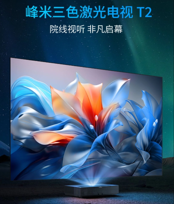 Fengmi officially launched the T2 three-color laser TV today, now available for pre-sale on JD.com. It features a 0.21:1 projection ratio and 480 nits of brightness. The initial offer is priced at 18,999 yuan, and it is set at 15,999 yuan.
