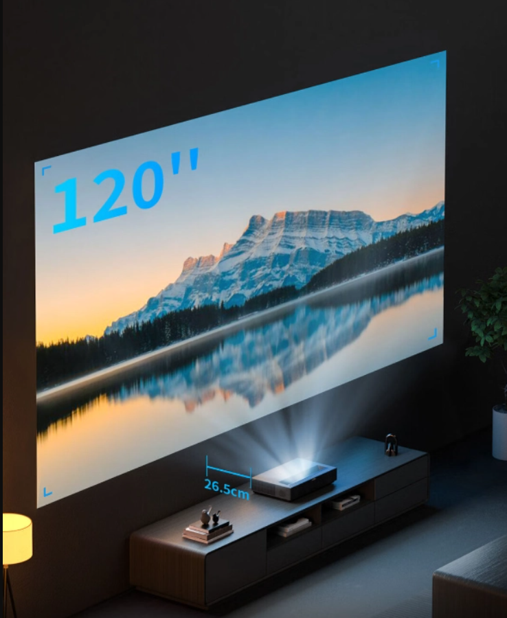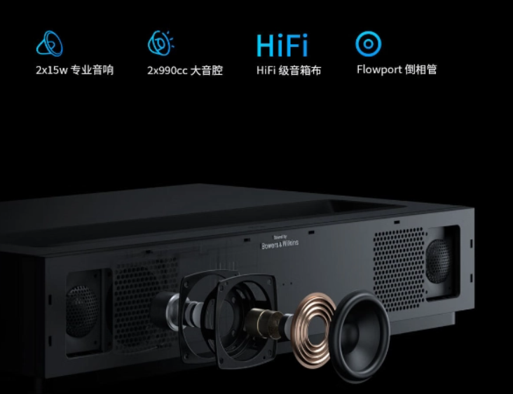 This Fengmi T2 laser TV covers 110% of the BT.2020 color gamut, supports over 1.07 billion colors, and features a 0.21:1 ultra-short focus lens design that projects a 120-inch screen from just 26.5 cm away from the wall.