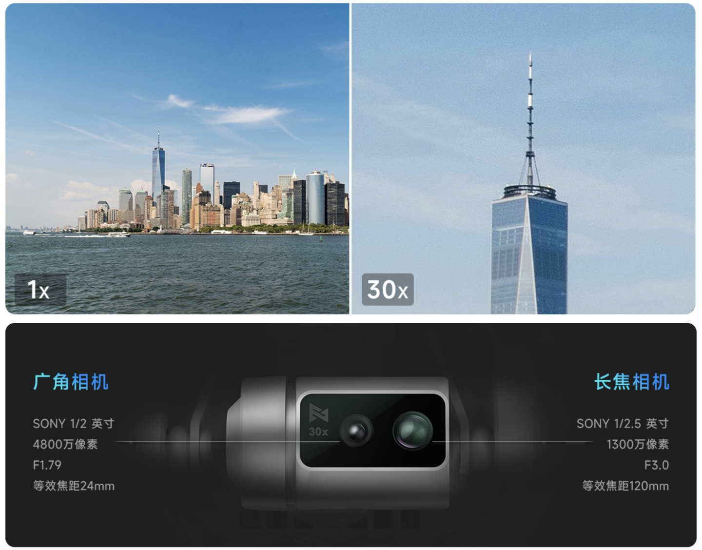 According to reports, this drone is equipped with SONY 48MP 1/2 inch F/1.79 wide Angle main camera (equivalent 24mm) + 13MP 1/2.5 inch F/3.0 telephoto (equivalent 120mm), claiming to provide 30 times hybrid zoom, support shooting 4K@60FPS video, At the same time, it is equipped with AI ISP, which claims to provide 4 times noise reduction, enhance the clarity of low-light images, and achieve brighter and purer “super night scene” shooting.