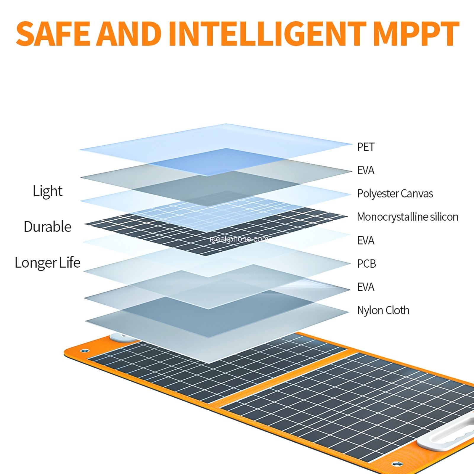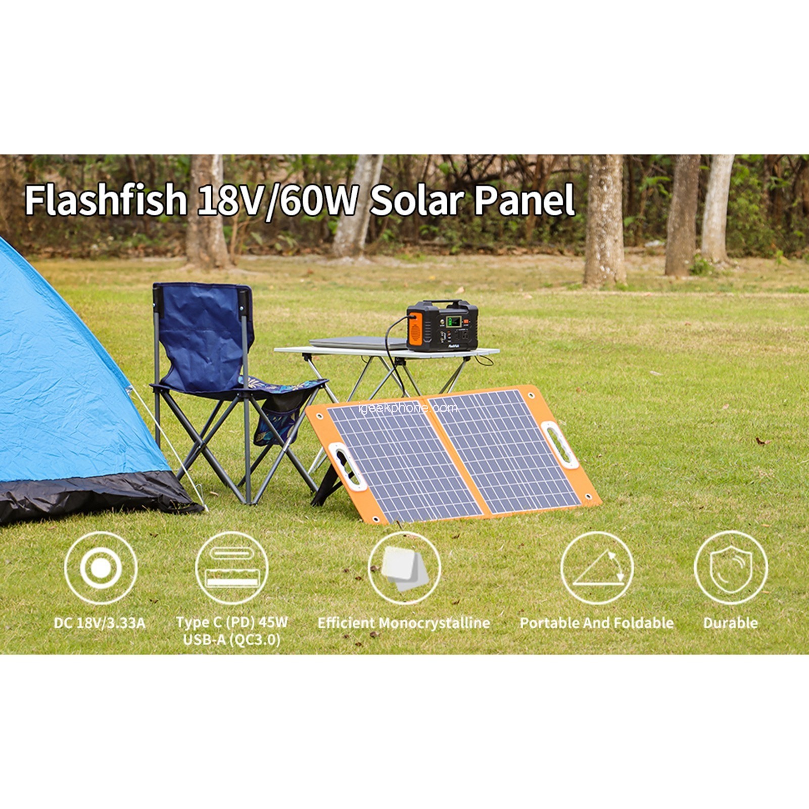 The Flashfish 18V/60W Foldable Solar Panel is a versatile and efficient charging solution for outdoor enthusiasts. With its 3 different sizes of connectors (8mm/5.5×2.5mm/3.5×1.35mm) and DC Cable (5.5×2.1mm); it is compatible with Flashfish 151Wh/166Wh/222Wh/300Wh portable power stations and most other power stations on the market. This foldable solar panel is constructed with high-efficiency solar arrays; boasting an impressive 21.5-23.5% efficiency, ensuring maximum conversion of solar power into usable energy. It features a USB-A Output (QC3.0 18W) and a USB-C Output (PD Type-c 45W); enabling quick charging for various devices such as cellphones, tablets, portable fans, emergency lights, cameras, and more. Whether you’re camping, hiking, or facing an emergency situation; the Flashfish 18V/60W Foldable Solar Panel provides a reliable and convenient power source.