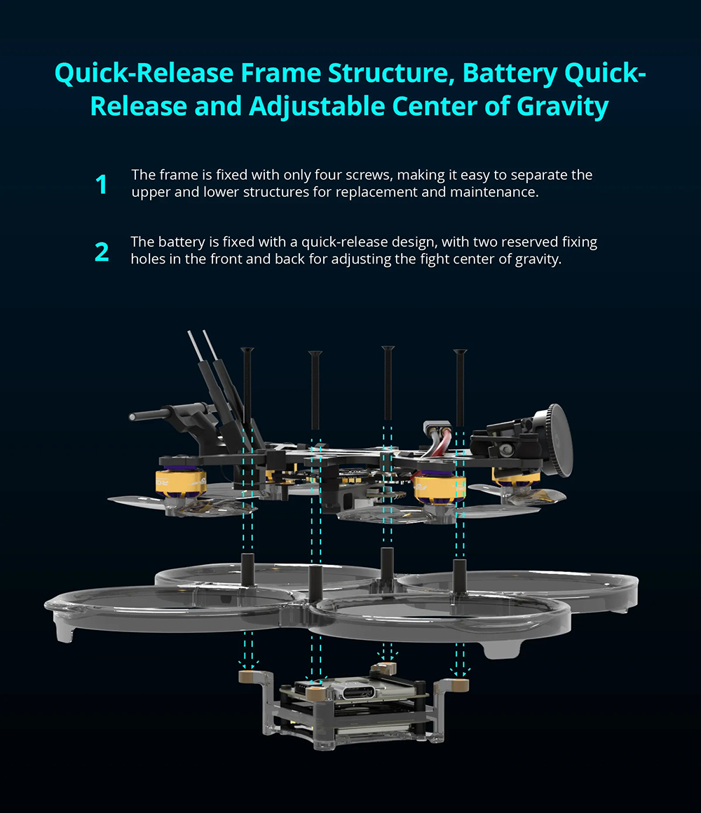 The FlyLens 85 boasts a unique design that sets it apart in the FPV racing drone landscape. Notably, it adopts the latest DJI O3 digital transmission system, available in both the standard DJI O3 and the lighter DJI O3 Lite versions. The three-point CNC damping platform for the camera ensures a steady view without the dreaded jelly effect, contributing to high-quality video recording. Additionally, the high-strength PC injection-molded protective ring enhances the drone’s durability and safety, showcasing a commitment to both performance and pilot security.