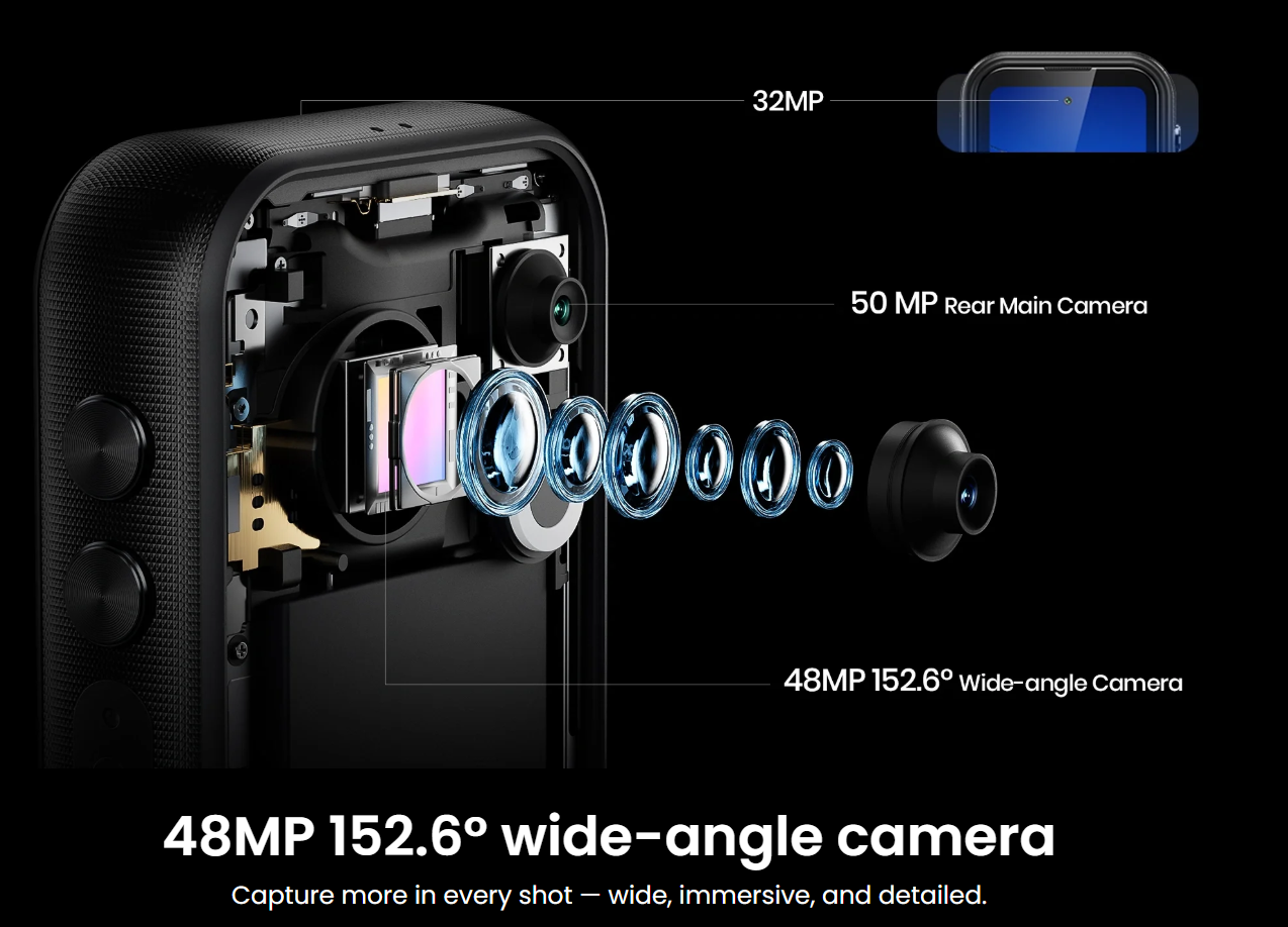 One of the standout features of the FOSSiBOT F116 Pro 5G is its powerful camera system designed for action and creativity. The phone includes a 48MP 152.6° ultra-wide-angle camera that captures immersive landscapes and dynamic moments with impressive detail. A dedicated camera button allows instant access, enabling users to capture moments immediately without unlocking the phone.