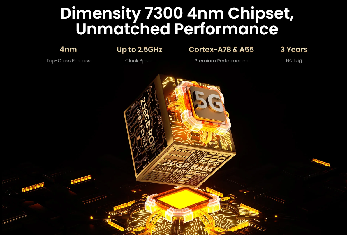 Powering the device is the advanced MediaTek Dimensity 7300 4nm chipset, delivering exceptional speed and energy efficiency. Combined with 12GB RAM and 256GB storage, the phone handles multitasking, gaming, and media creation effortlessly. Users can even expand memory up to 36GB (12GB + 24GB expansion) and add up to 1TB via TF card, providing massive storage for photos, videos, and apps.