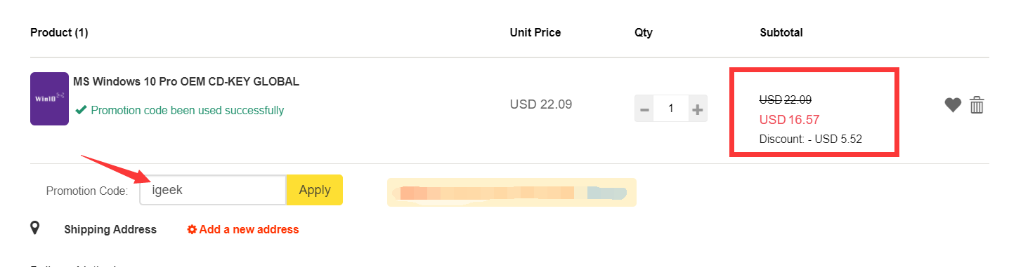 This page confirms what you ordered and lets you enter the code igeek for savings.