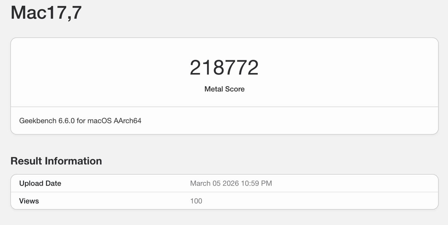 In the Metal graphics test, the M5 Max (with a 40-core GPU) conducted two runs, yielding scores of 218,772 points and 232,718 points respectively. Compared to the score of the M3 Ultra, it was approximately 5-10% lower, but it was 20% higher than that of the M4 Max.