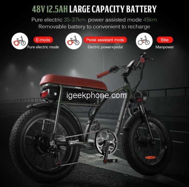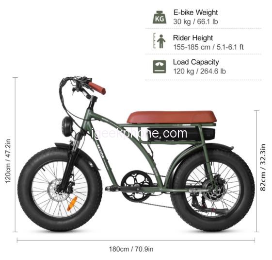 impress with its design. It is reminiscent of historic motorcycles that have been, are, and always will be very trendy. But design is not everything. The BEZIOR XF001 Fat Tire Electric Bicycle comes with a powerful 1,000 W motor driving the rear wheel. Thanks to this, the bike can develop a speed of up to 45 km / h and overcome a climb of up to 25 °. Due to the ability to achieve higher speeds, it is suitable for adults who can weigh up to 120 kg. That’s exactly what a robust aluminum construction can carry. The green chassis is complemented by a soft brown seat and two 20 “tires that are up to 4” wide. They are designed for driving on uneven ground, whether in the forest or in a meadow.