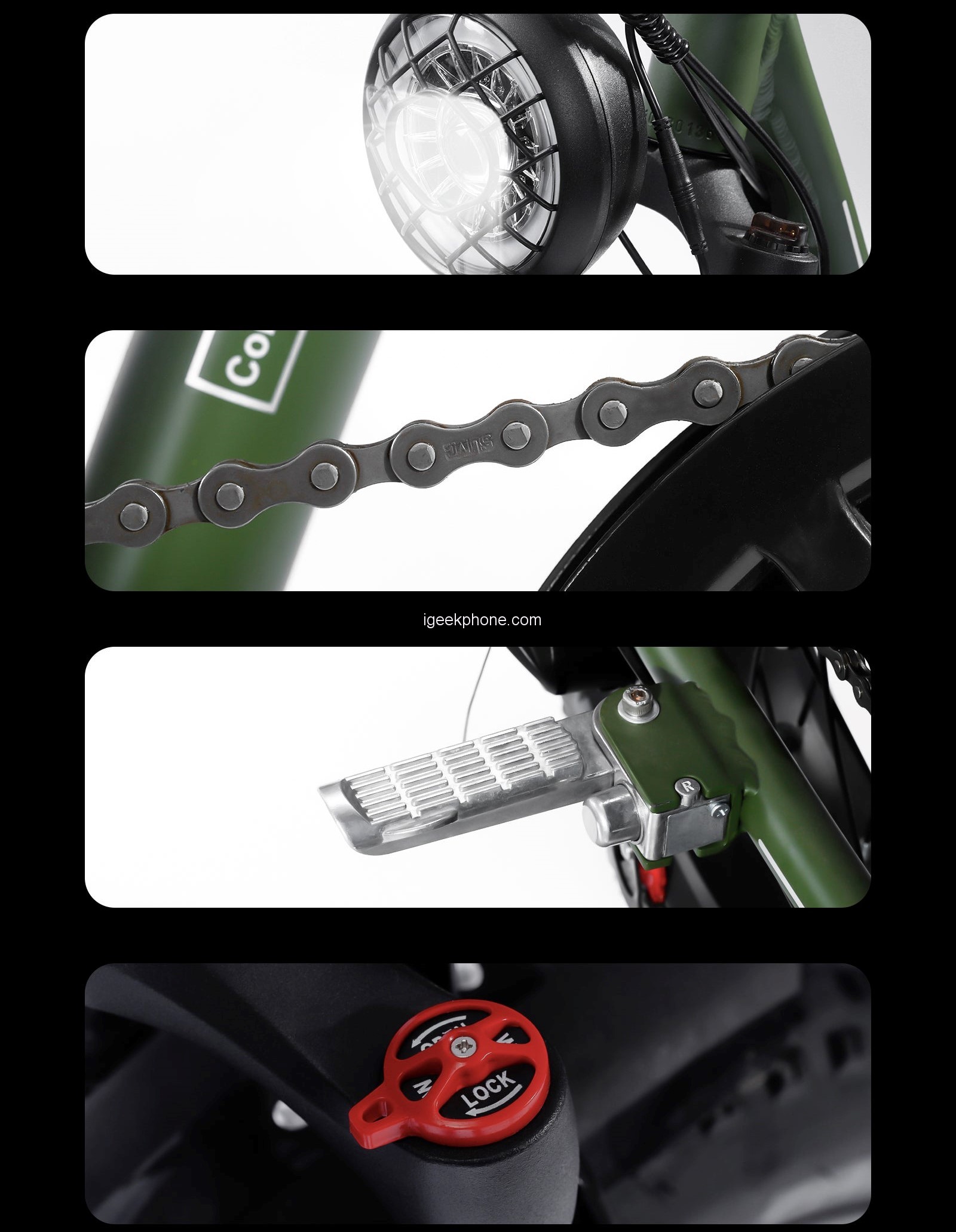 Don’t worry, they won’t get lost in driving around the city, during which they will give you greater grip and driving safety. There is a large LCD display on the handlebars, which constantly informs you about the battery status, driving mode, current speed, and mileage. During the evening rides, you will appreciate the strong LED front light. You will also be seen from behind, thanks to the rear light located in the battery block. In the case of this BEZIOR XF001 Fat Tire Electric Bicycle, it is located under a comfortable seat.