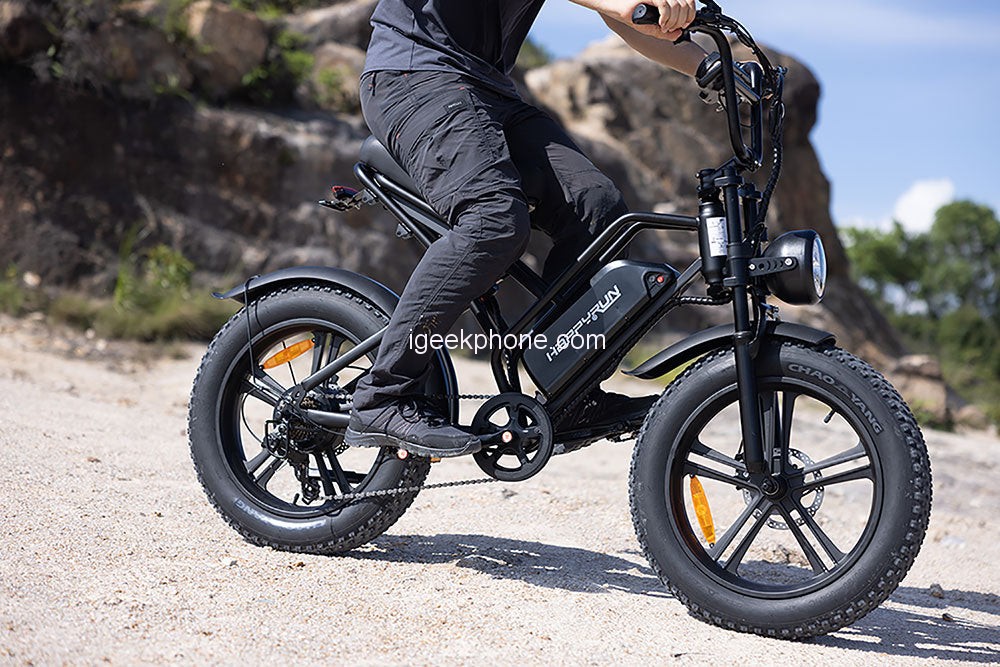 The design of the HAPPYRUN G50 is both striking and practical. Its sturdy steel frame not only ensures durability but also provides a rugged appearance that’s perfectly suited for off-road adventures. The fat tires, measuring 20*4.0 inches, are the standout feature here, designed to handle various terrains with ease, from snowy landscapes to sandy beaches and rugged mountain trails to city roads. These tires offer stability, grip, and comfort, making your rides smooth and enjoyable, regardless of the surface.