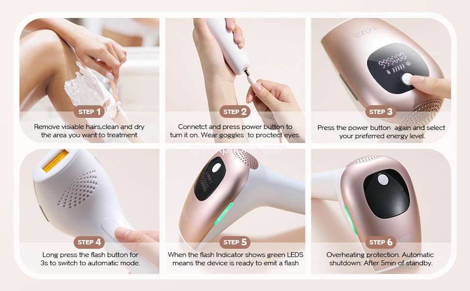 INNZA D-1176 IPL Hair Removal has 5 adjustable energy levels to accommodate different skin sensitivities and treatment areas.2-button design, easy to use and adjust energy levels and modes. And the large LCD display, you can clearly control the state when operating. IPL hair removal has two models. Auto mode is suitable for large treatment areas, like leg, back, and arm; Manual mode is used for a sensitive or smaller areas,like bikini lines, upper lip, and armpit.
