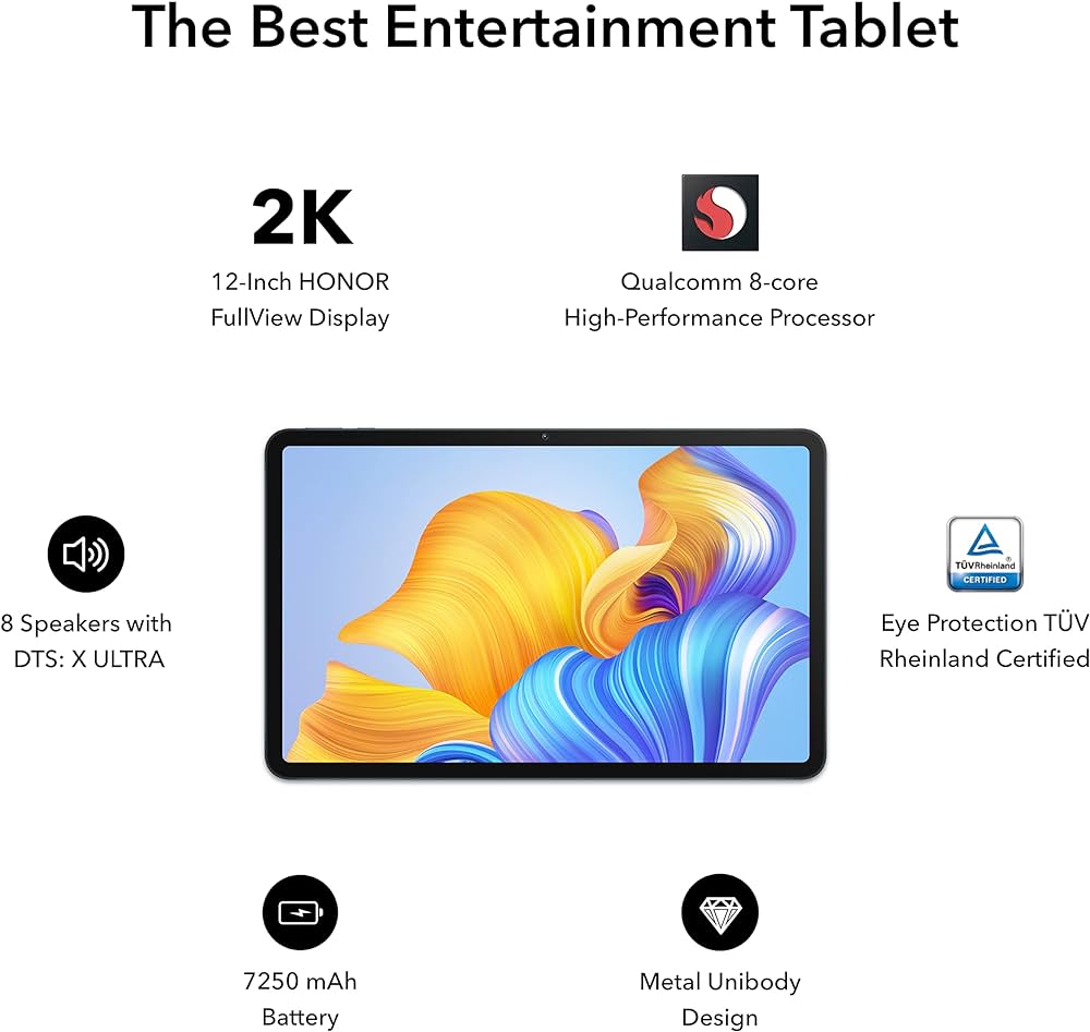 The HONOR Pad 8 comes equipped with the all-new desktop layout of Magic UI 6.1. Access large folders with a single touch and stay organized effortlessly. Protect your eyes with dual eye protection certification, including low blue light and no strobe features. Multiple eye protection modes ensure your eyes are safe during extended usage. With a massive 7250mAh battery and 22.5W fast charging, the HONOR Pad 8 offers up to 14 hours of battery life for audiobook listening and offline video, 10 hours for online classes, and up to an astounding 59 days on standby.