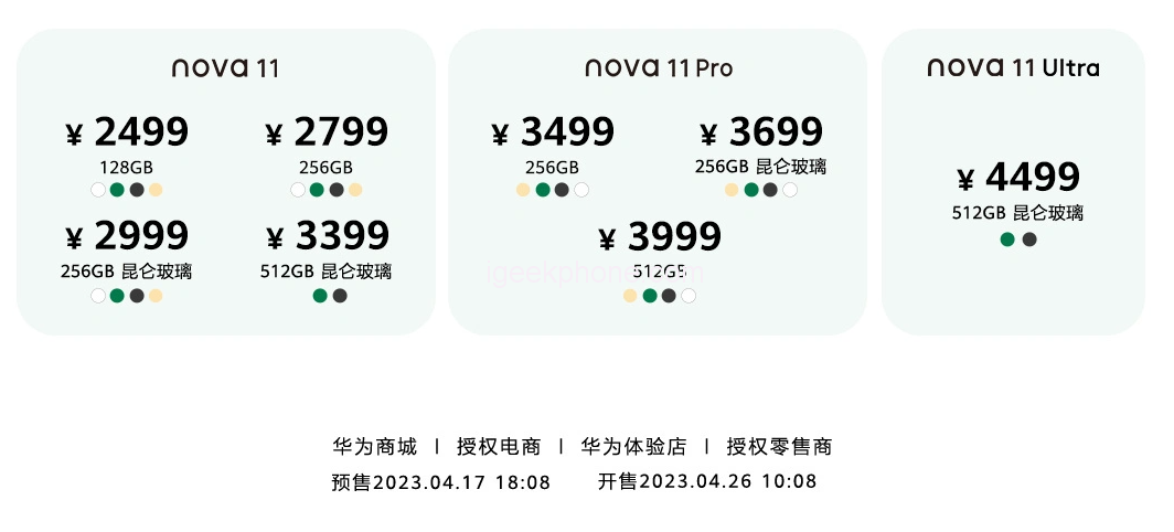 The Huawei Nova 11 series comes in four versions and four color options, including No. 11 color, Yaojin black, snowy white, and dawn gold. The device is available in 128GB and 256GB versions of the standard glass edition, Kunlun Glass Edition 256GB version, and Kunlun Glass Edition 512GB version. The 128GB version of the classic glass version starts at 2499 yuan, while the Kunlun Glass Edition 512GB version is priced at 3399 yuan.