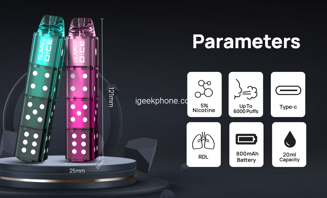 The GLAMEE DICE and GLAMEE META are both disposable vape pods with several similar features. Both have a pre-filled e-liquid capacity of 20ml, a mesh coil, and a 25W power output. Both also have an 800mAh battery with Type-C charging and can last for up to 6000 puffs. The main difference between the two is that the DICE is designed for RDL vaping and the META is designed for a smooth, hard throat-hit, and flavorful vaping experience. Both of the products come in a variety of flavors.