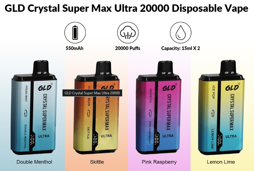 The GLD Crystal Super Max Ultra 20000 Disposable Vape is a powerhouse in the vaping world, offering an impressive 20,000 puffs and a host of advanced features. This device is designed to cater to both seasoned vapers and newcomers, promising a unique and satisfying experience. With dual 15ml pre-filled e-liquid compartments and a 550mAh rechargeable battery, this vape sets a new standard for convenience and performance.