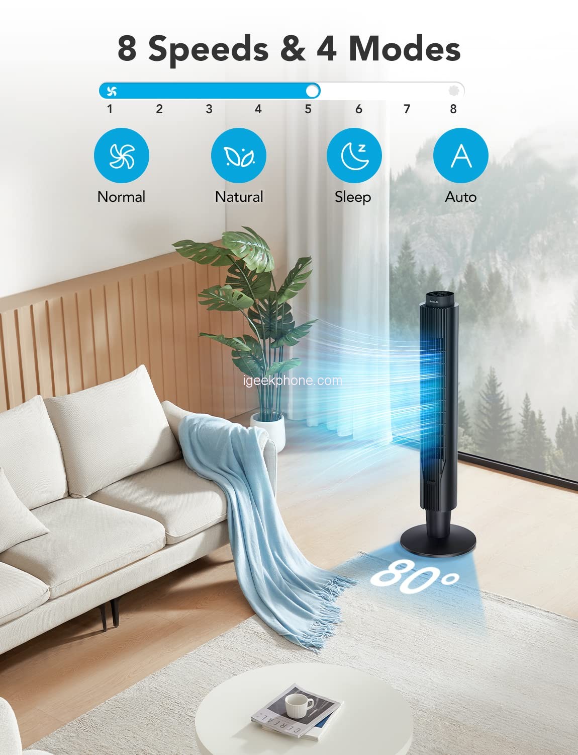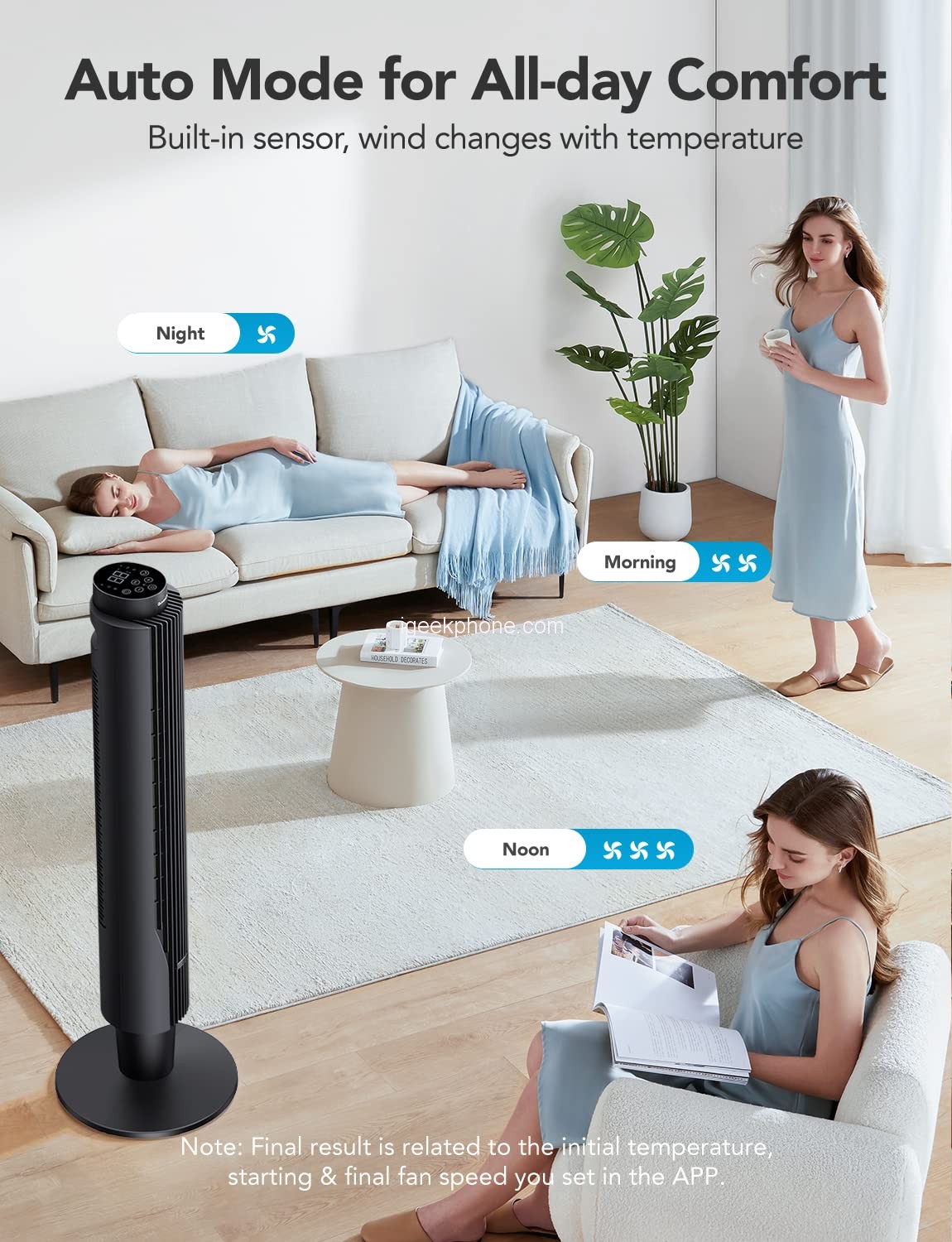 This advanced tower fan offers a range of features that make cooling down a breeze. Thanks to its compatibility with Alexa and Google Assistant, you can control the fan effortlessly using voice commands. Through the user-friendly Govee Home App, you have the power to personalize your fan experience by creating schedules, adjusting modes and speeds, and setting a convenient 24-hour timer. The fan’s built-in sensor automatically adjusts its speed based on the surrounding temperature, ensuring optimal cooling efficiency. For even greater control, you can pair it with a Govee thermohygrometer to manage how your room responds to changing temperatures, especially when the sun heats things up in the afternoon.