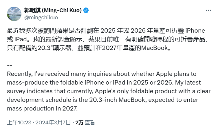 In response, Tianfeng International analyst Guo Mingqi said today: “Recently I have been asked several times whether Apple plans to mass-produce foldable iPhone or iP in 2025 or 2026 According to my latest research, the only foldable product that Apple currently has a clear development timeline is the MacBook with a approximately 20.3″ display and expected production in 2027.”
