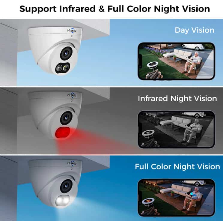 Traditional security cameras rely on infrared (IR) LEDs that produce black-and-white night vision. The Hiseeu camera upgrades this experience: