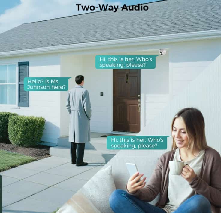 Two-Way Audio: Built-in microphone and speaker allow you to listen to what’s happening and speak through the camera via the app. This is useful for greeting visitors, warning off intruders, or communicating with family members.