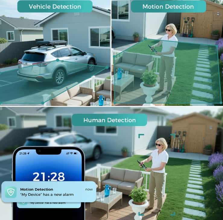 Human Detection Technology: Unlike basic motion sensors that trigger alerts for moving leaves or pets, this camera uses AI algorithms to distinguish human shapes from other motion. This drastically reduces false alarms and ensures you are only notified about events that matter, saving you time and attention.