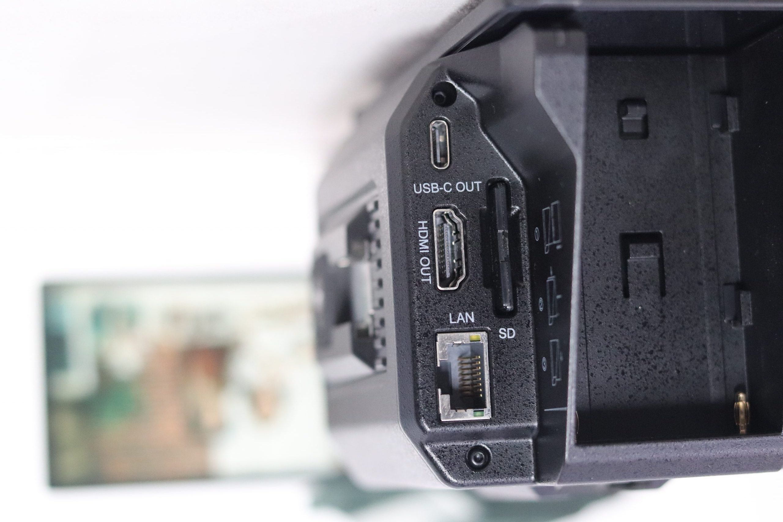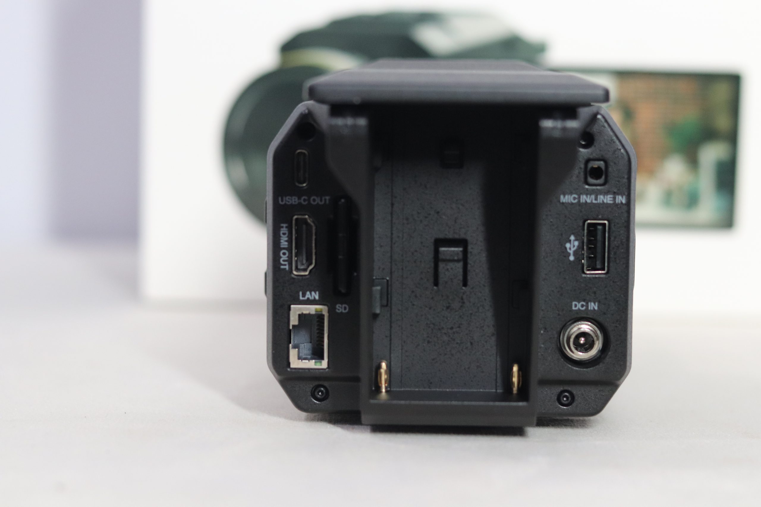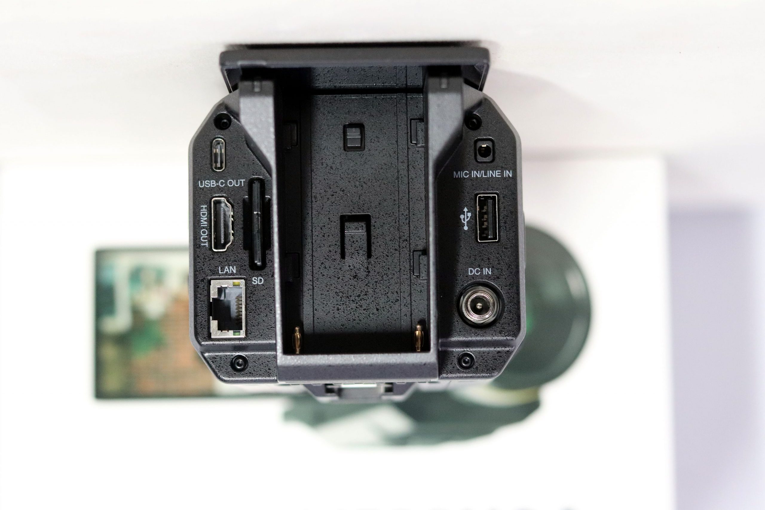 Turning our attention to the back, the camera houses a Sony battery, a 12-volt power input, and a Type-A USB connector. Additionally, the rear panel features a microphone and line inputs, catering to the diverse audio needs of users. The thoughtful design extends to the inclusion of a USB-C battery pack, HDMI output, a gigabit network connector, and a discreetly hidden SD card slot.