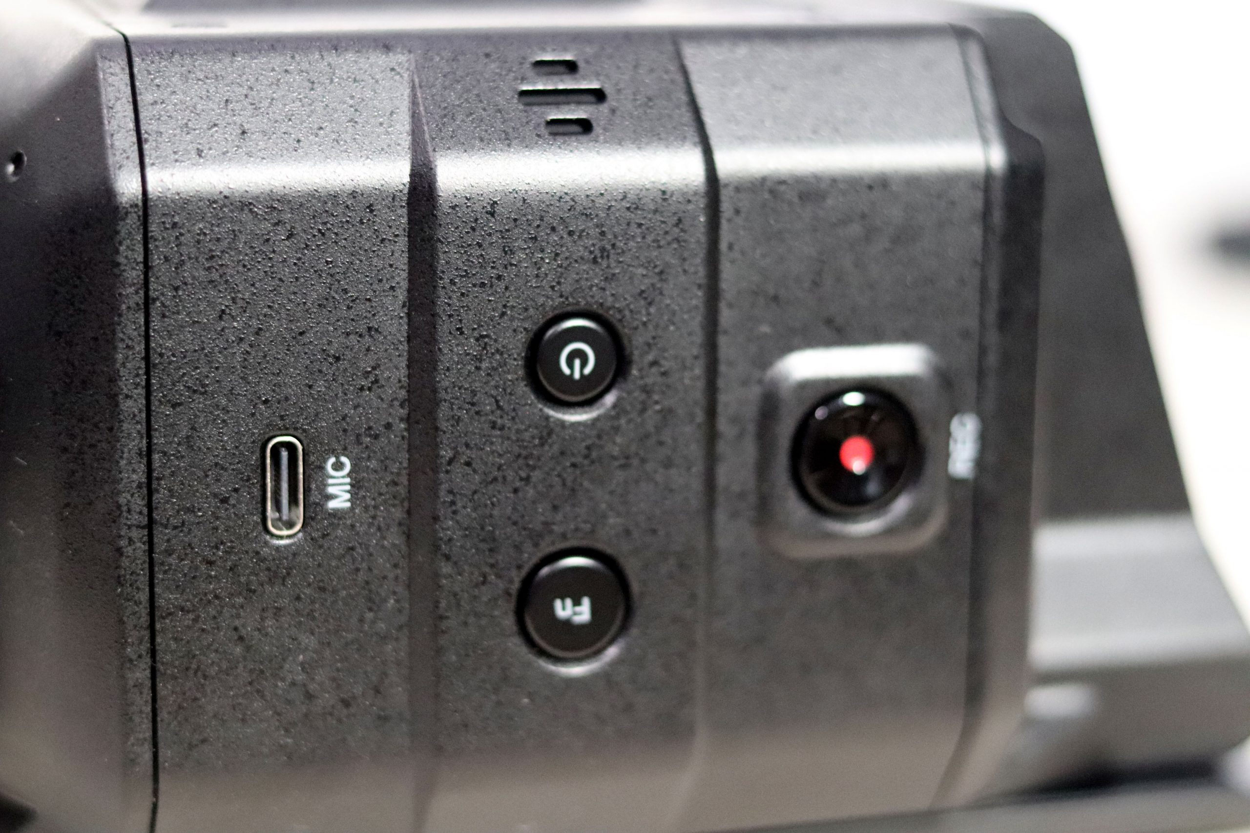 The side profile reveals a power button, a record button, and a function button, offering intuitive control at the user’s fingertips. A Type-C connector for connecting a Hollywood microphone adds to the device’s versatility, catering to the audio preferences of professionals and enthusiasts alike.