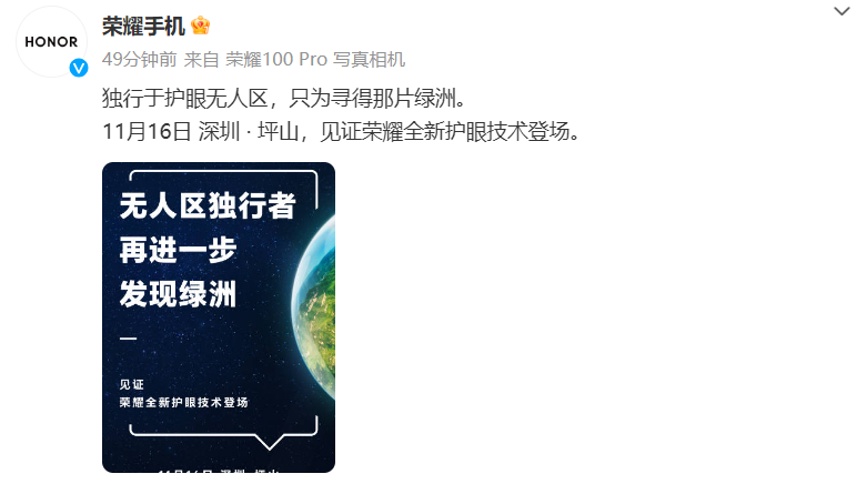 Igeekphone, November 15 news, Honor mobile phone today announced that it will release a new eye care technology on November 16 (tomorrow), officially declared that “alone in the eye care no man’s land, only to find the oasis.”