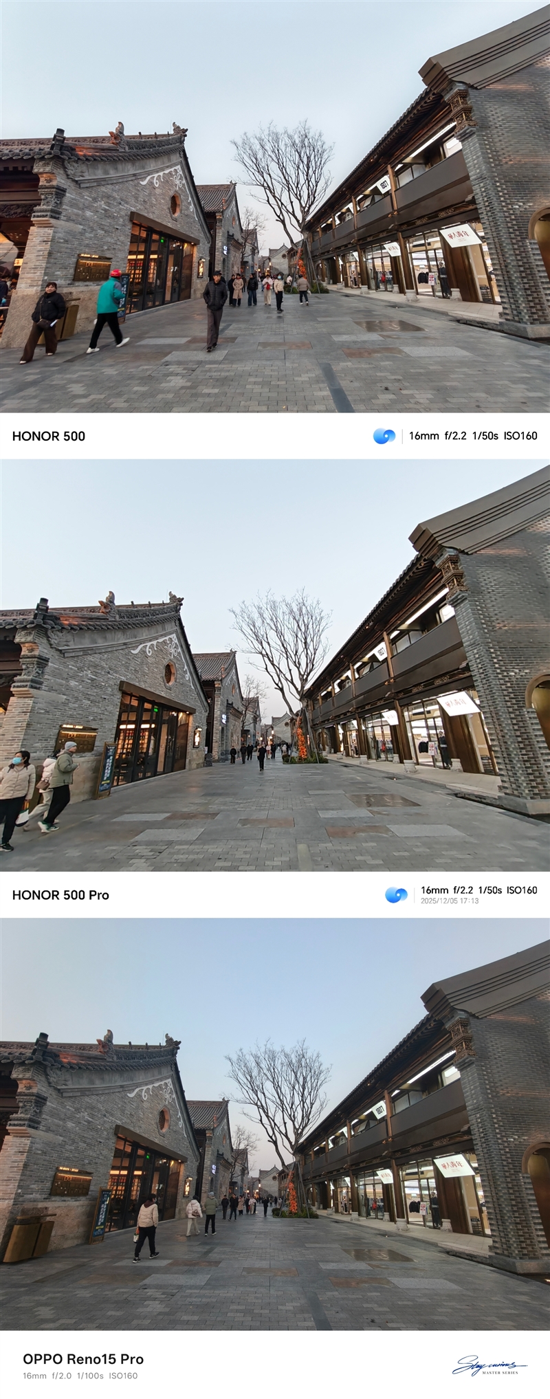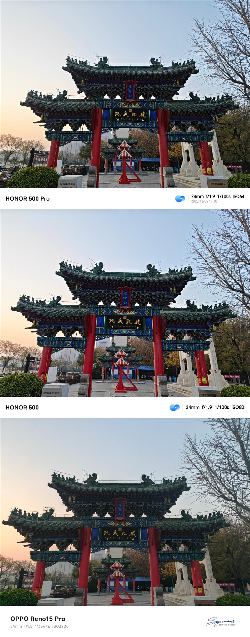 This sunset shot really highlights the gap. The Reno 15 Pro falls way behind the two Honor 500 models—you can barely make out the brick details on the building to the right.