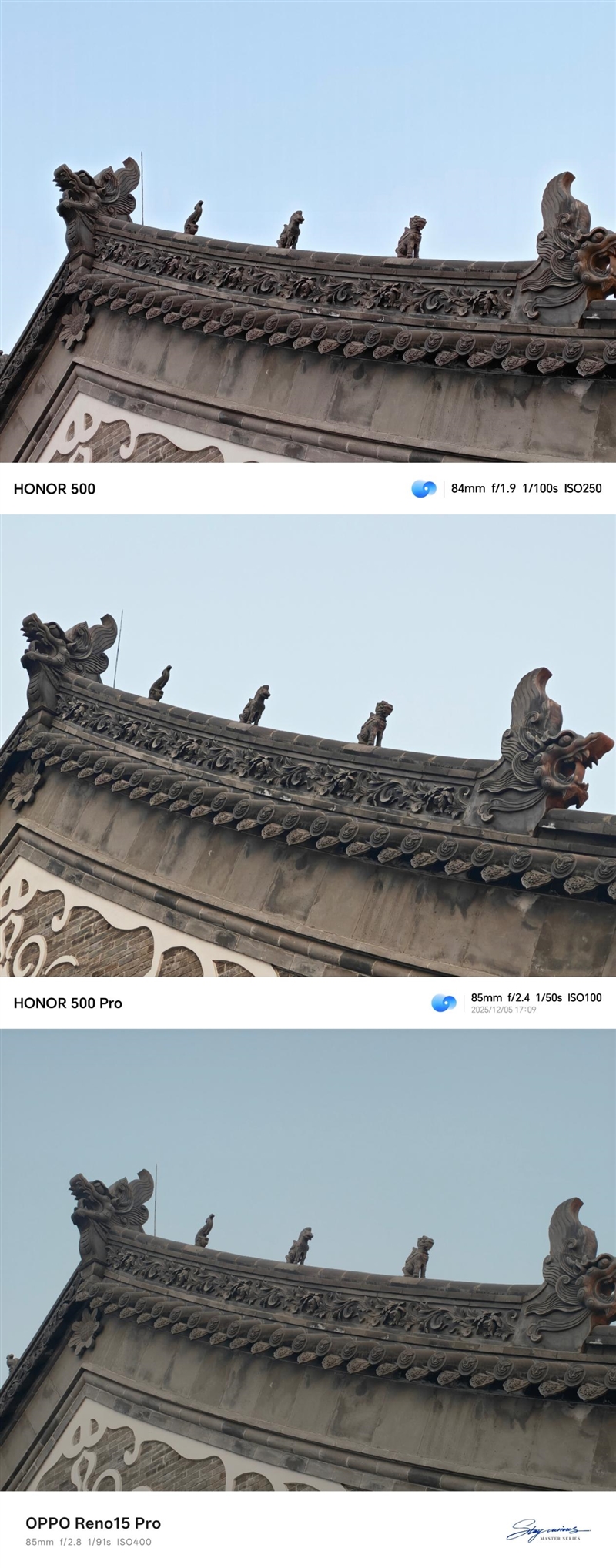 When you compare it to the actual telephoto lenses on the Reno 15 Pro and Honor 500 Pro, the detail differences aren’t huge. The Honor 500 Pro comes out on top with the sharpest image, but honestly? The regular Honor 500 holds its own surprisingly well.