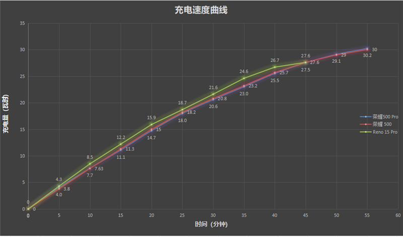 From the graph, you can see that all three phones charge at similar rates, with the Reno 15 Pro being slightly faster. However, because of its smaller battery, it hit full charge at the 45-minute mark. The Honor 500 series charged a bit slower but stayed competitive throughout. By the 45-minute point, it had accumulated nearly the same total charge as the Reno 15 Pro, and reached 100% at around 55 minutes.