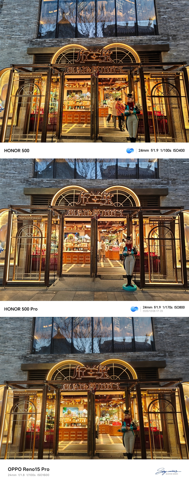 In low-light situations, the Honor 500 series really nails it with billboard lighting—no blown-out highlights at all. The rabbit on the right shows clearer detail than the Reno 15 Pro, though the Reno’s slightly darker approach does have its own moody appeal.