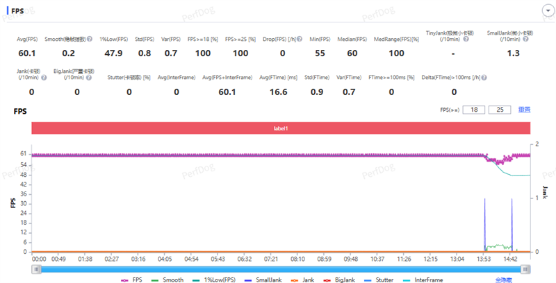 Testing Genshin Impact, we recorded an average of 60.1 FPS with a stability index of 0.2 and a 1% low of 47.9 FPS. There were a few frame drops toward the end, but the phone recovered quickly.
