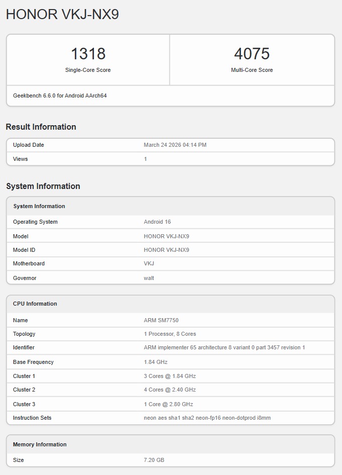 Although the GeekBench score page did not directly indicate the chip name, the CPU model “SM7750” points to the Qualcomm Snapdragon 7 Gen 4 processor (combined with Adreno 722 GPU). Additionally, the page information shows that this device will at least offer an 8GB configuration option.