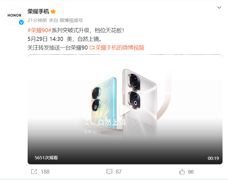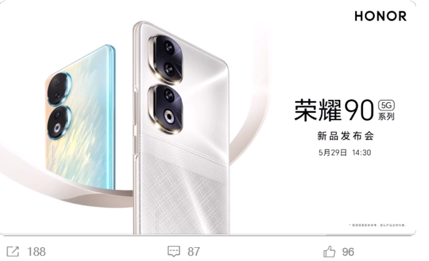 The official Weibo account of Honor Mobile phone announced that the Honor 90 series phone will be released at 14:30 on May 29. The promotional video shows the design of the new Honor 90 series phone, which uses a rear up-and-down circular camera module. It is expected that the rear panel will also have a special crystal design and bring a new color scheme.
