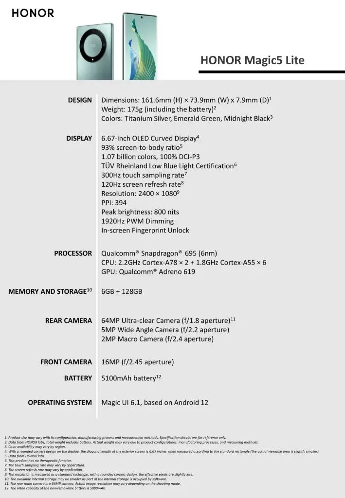 It’s worth noting that the Honor Magic 5 Lite is powered by the same Qualcomm Snapdragon 695 5G chip as its predecessor, and only offers a 6GB+128GB storage combination.