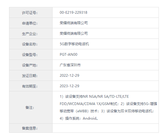Recently model for the PGT-AN00 Honor mobile phone into the network industry information department, it is reported that the phone belongs to Honor Magic 5 series, is expected to be released after the Spring Festival, the current “certificate photo” and detailed configuration information has not been published.