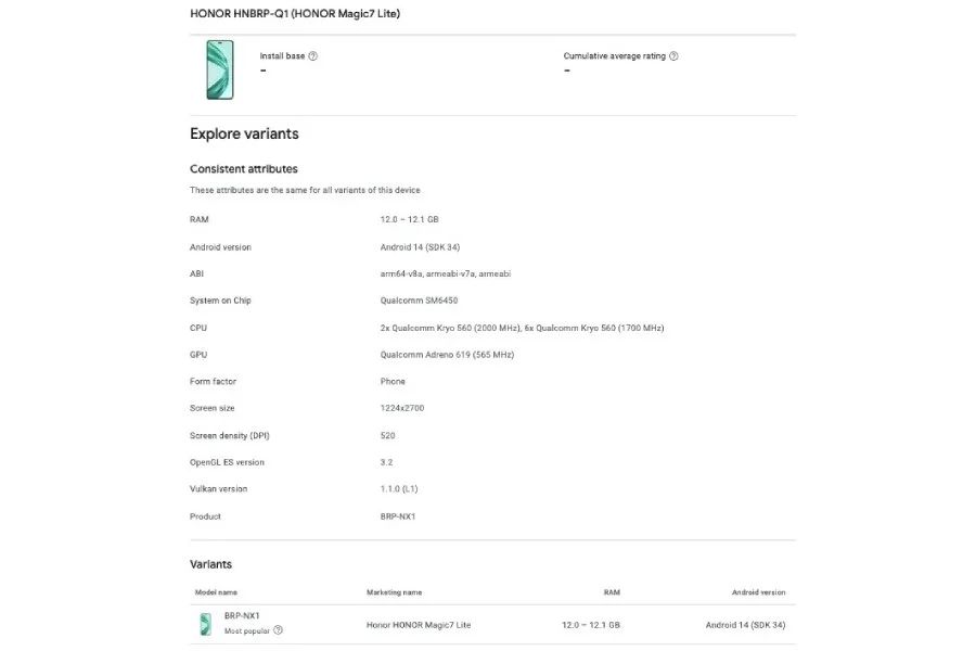 Igeekphone, November 7 news, science and technology media published a blog post today (November 7), reporting that Honor Magic 7 Lite mobile phone appeared on the Google Play Console, model HNBRP-Q1.