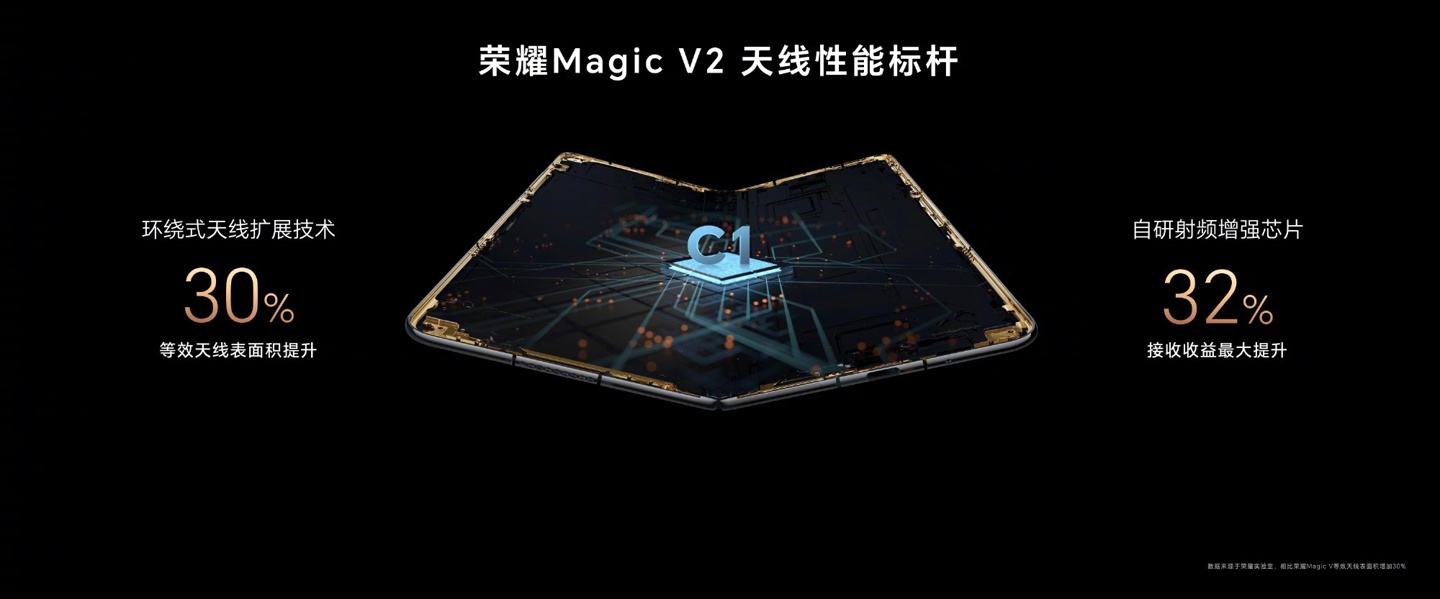 Honor MagicV2 is equipped with a self-developed RF enhancement chip and uses surround antenna expansion technology, claiming to create a new benchmark for antenna performance.