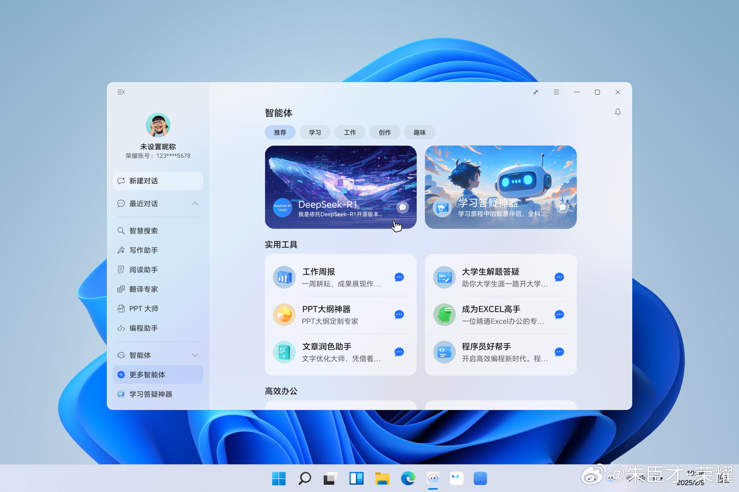 From the pictures released by @Zhu Chencai – Honor, Honor Notebook has customized applications, supporting intelligent search, writing assistant, reading assistant, translation expert, PPT master, programming assistant and other functions. The in-app “Agents” section also offers “More Agents” features, including the DeepSeek-R1 model.